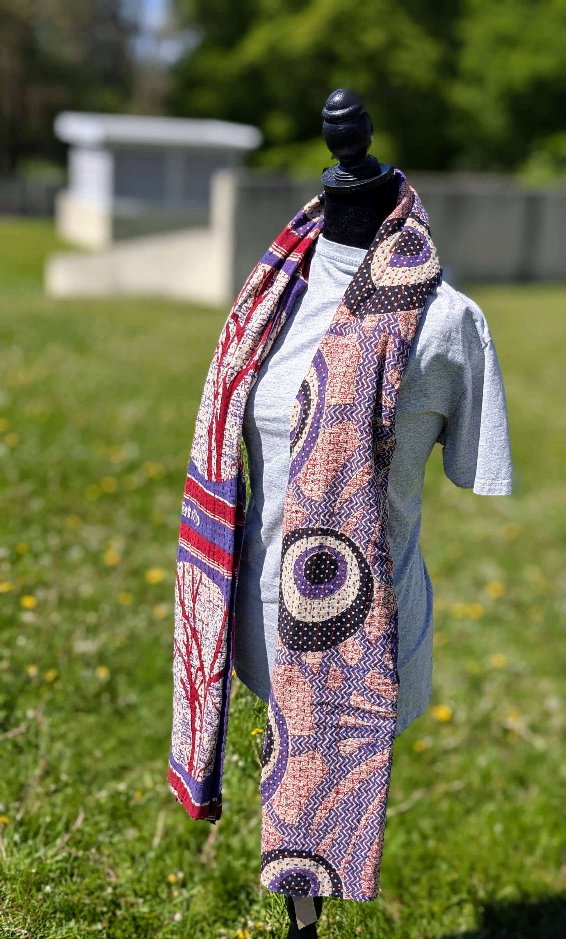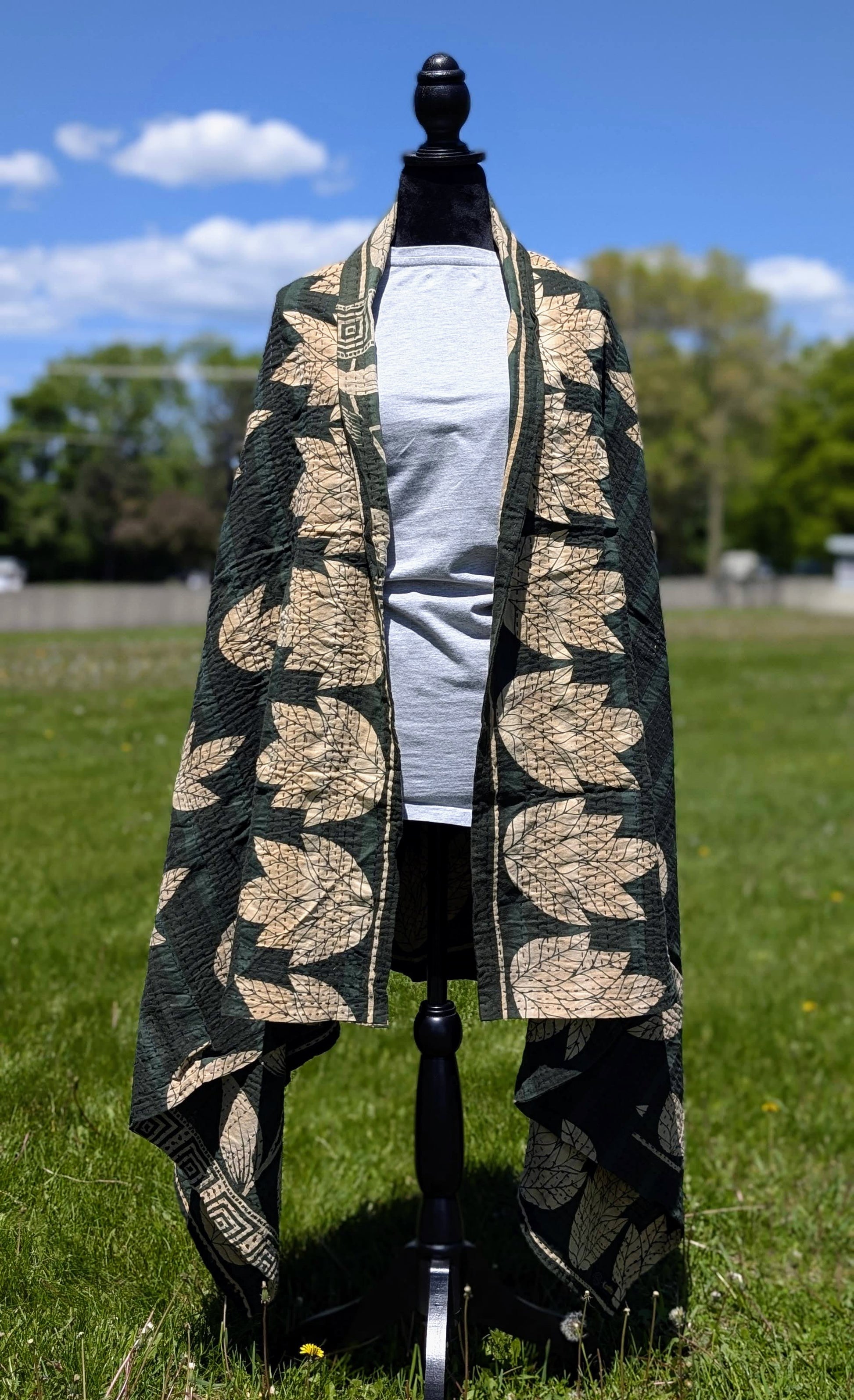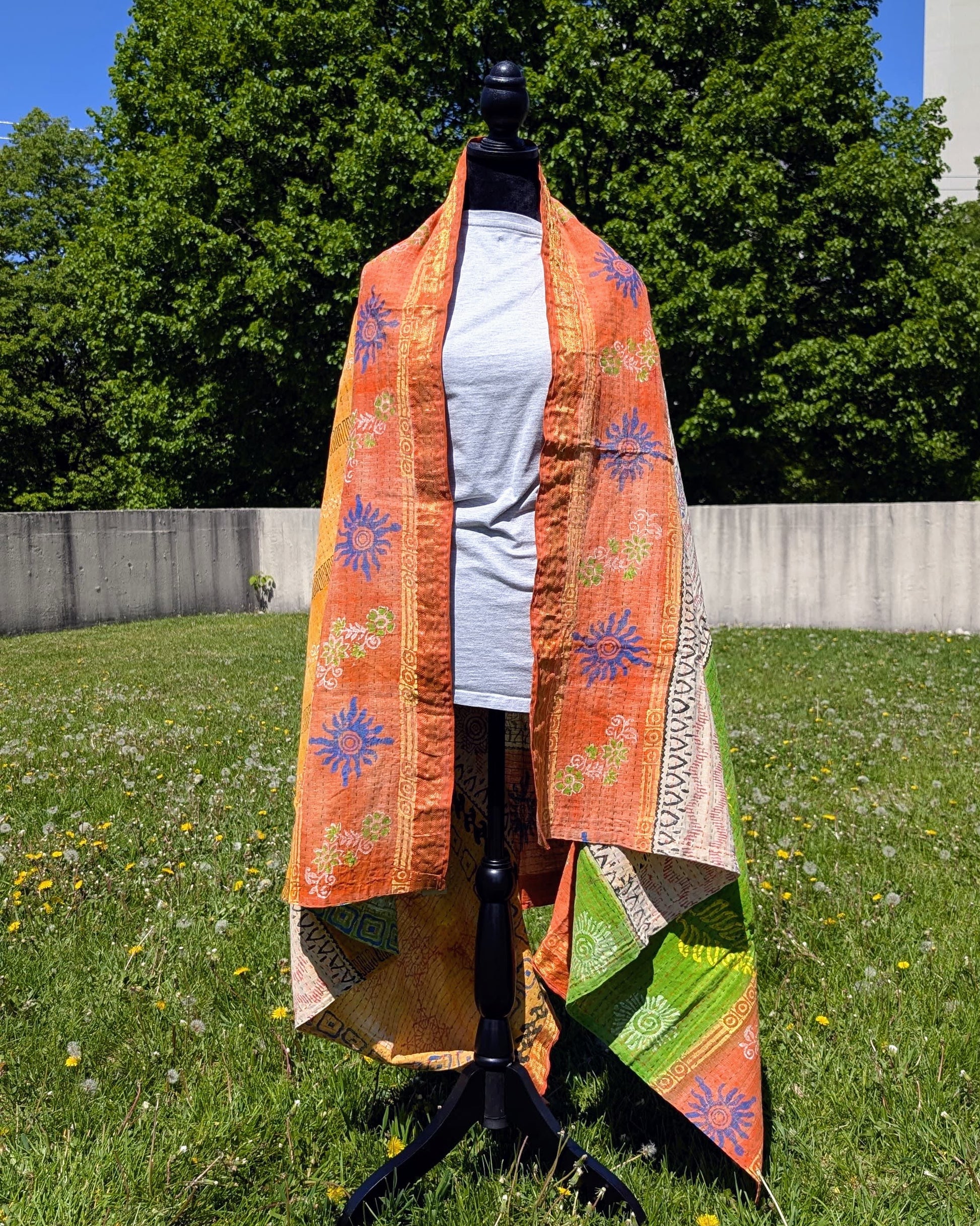Wrap yourself in the rich duality of heritage with this exquisite two-layer Kantha shawl. Meticulously hand-stitched by skilled artisans in Bangladesh and Canada from upcycled saris, this piece blends warmth and artistry through its unique double-layered construction—each side revealing a different embroidered story.