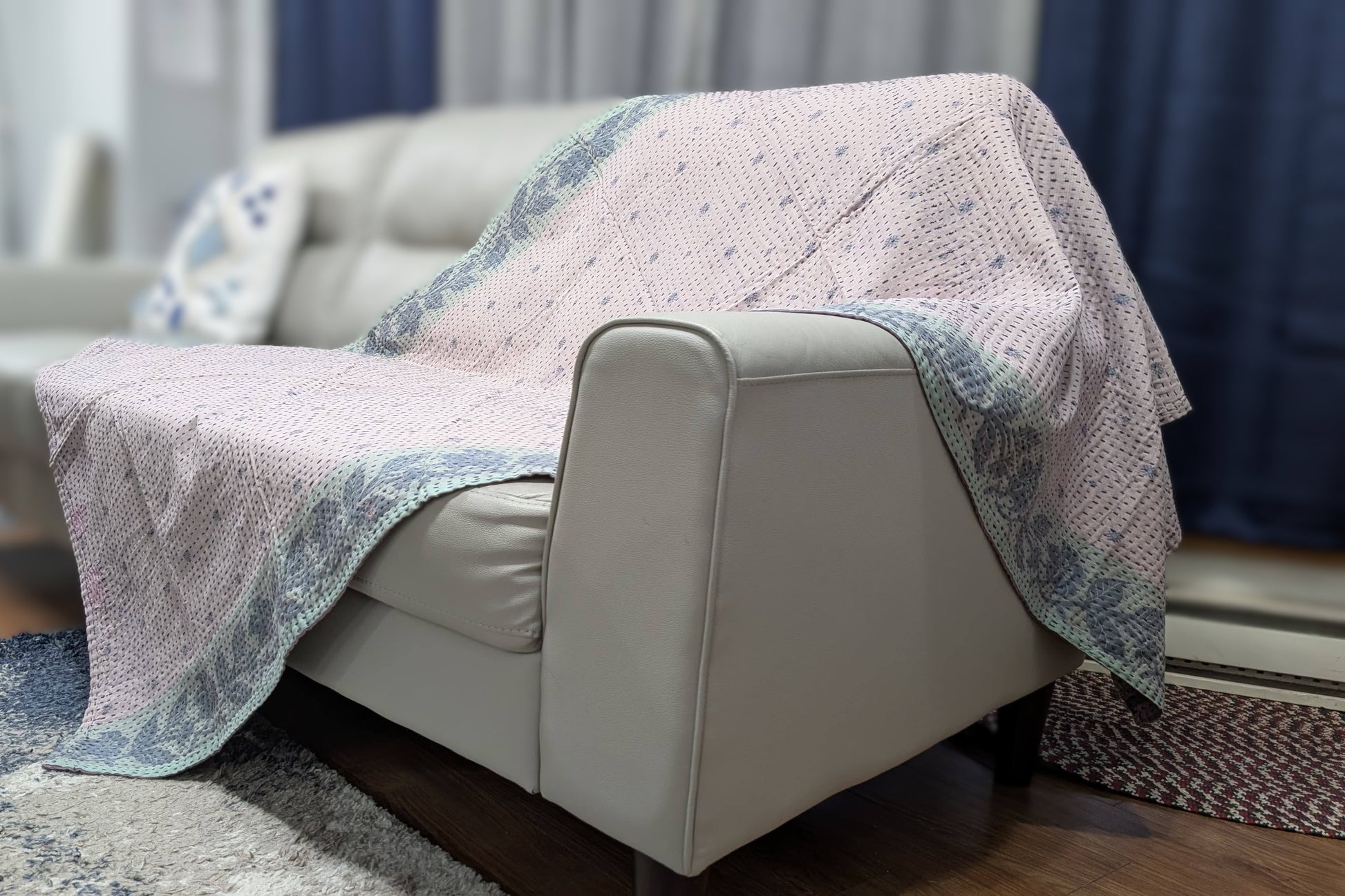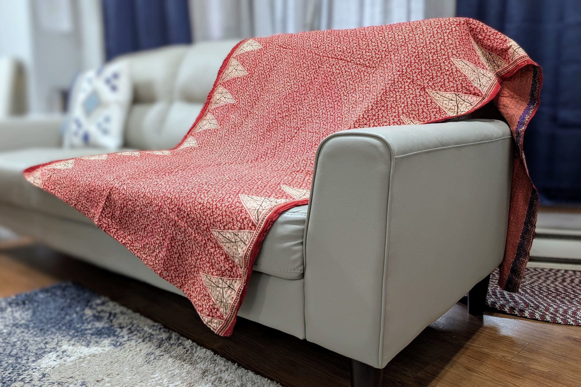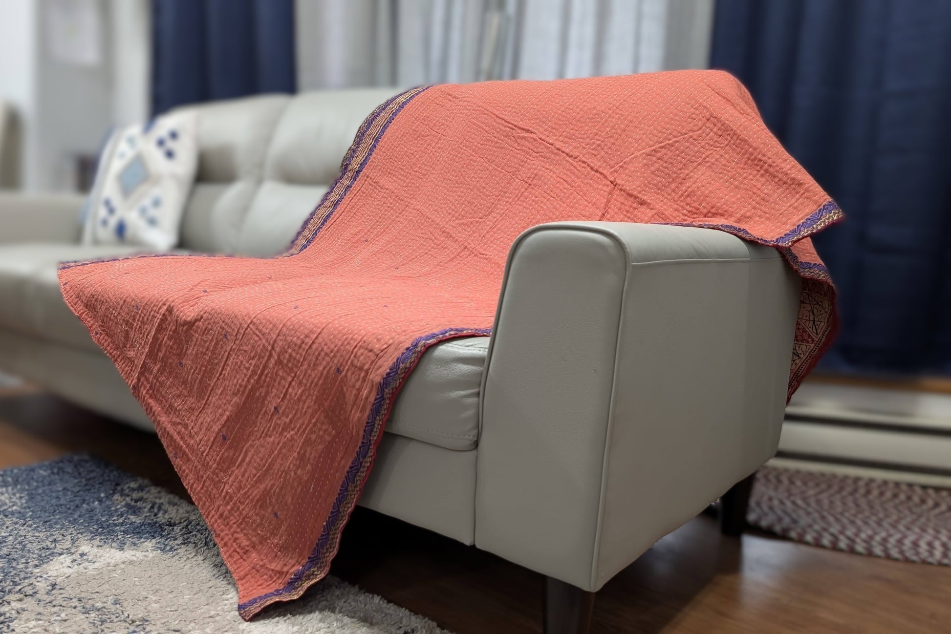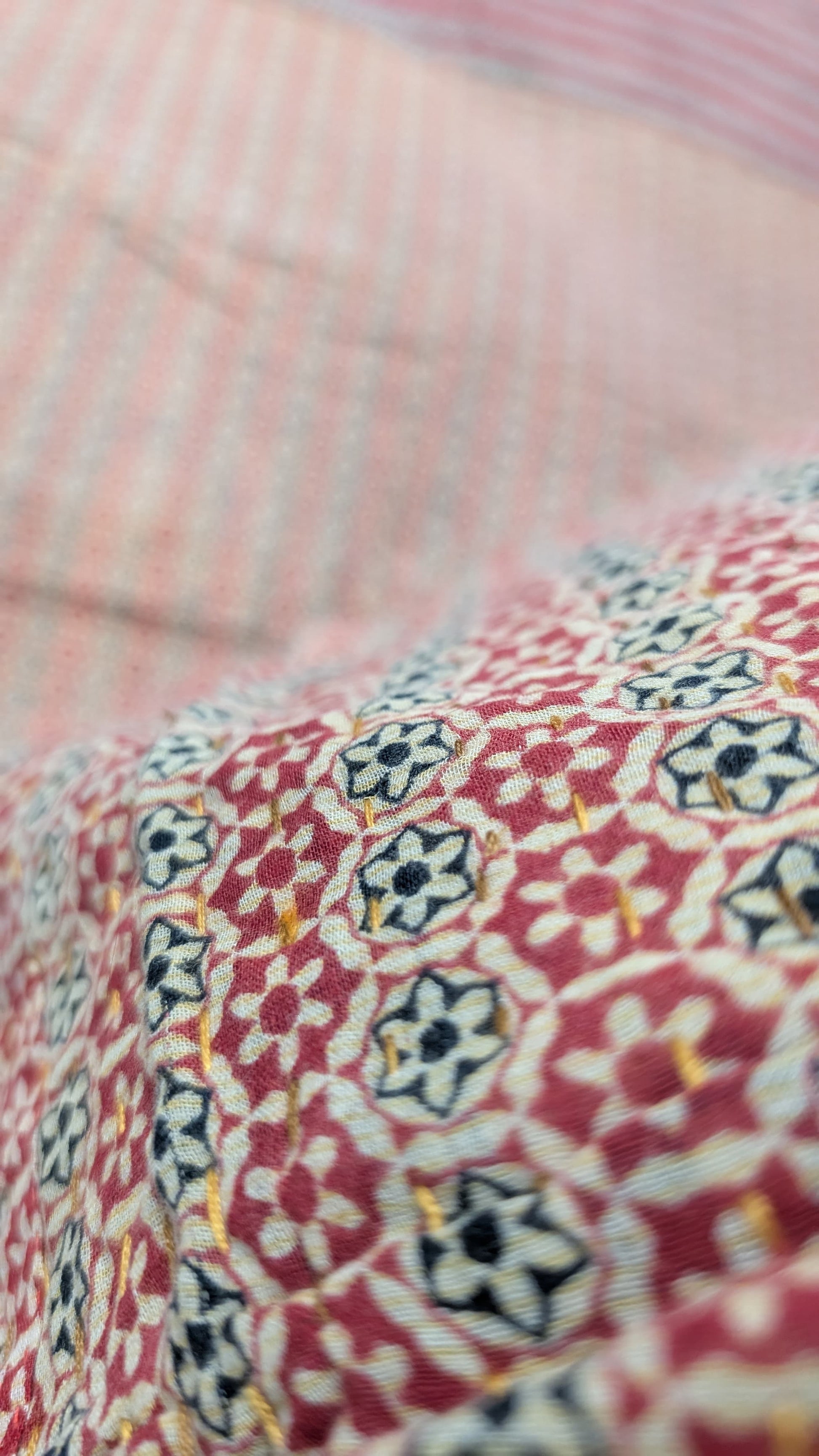 Wrap yourself in generations of tradition with our reversible medium-weight Kantha quilt—where the soul of Bangladesh meets sustainable comfort. Meticulously hand-stitched by rural artisans from recycled and upcycled saris, each quilt tells a visual story through its intricate running stitches and naturally faded patchwork of colours.