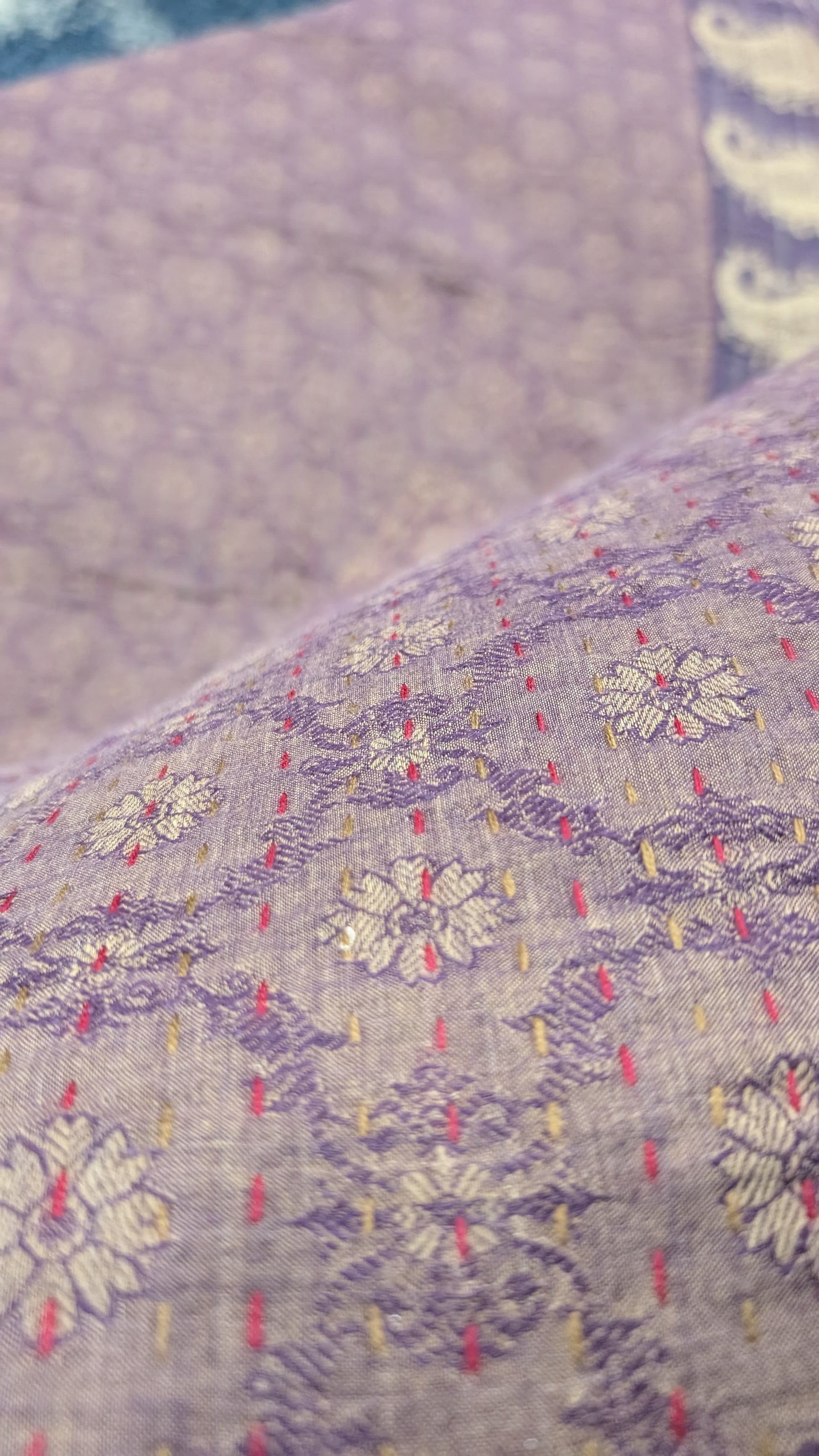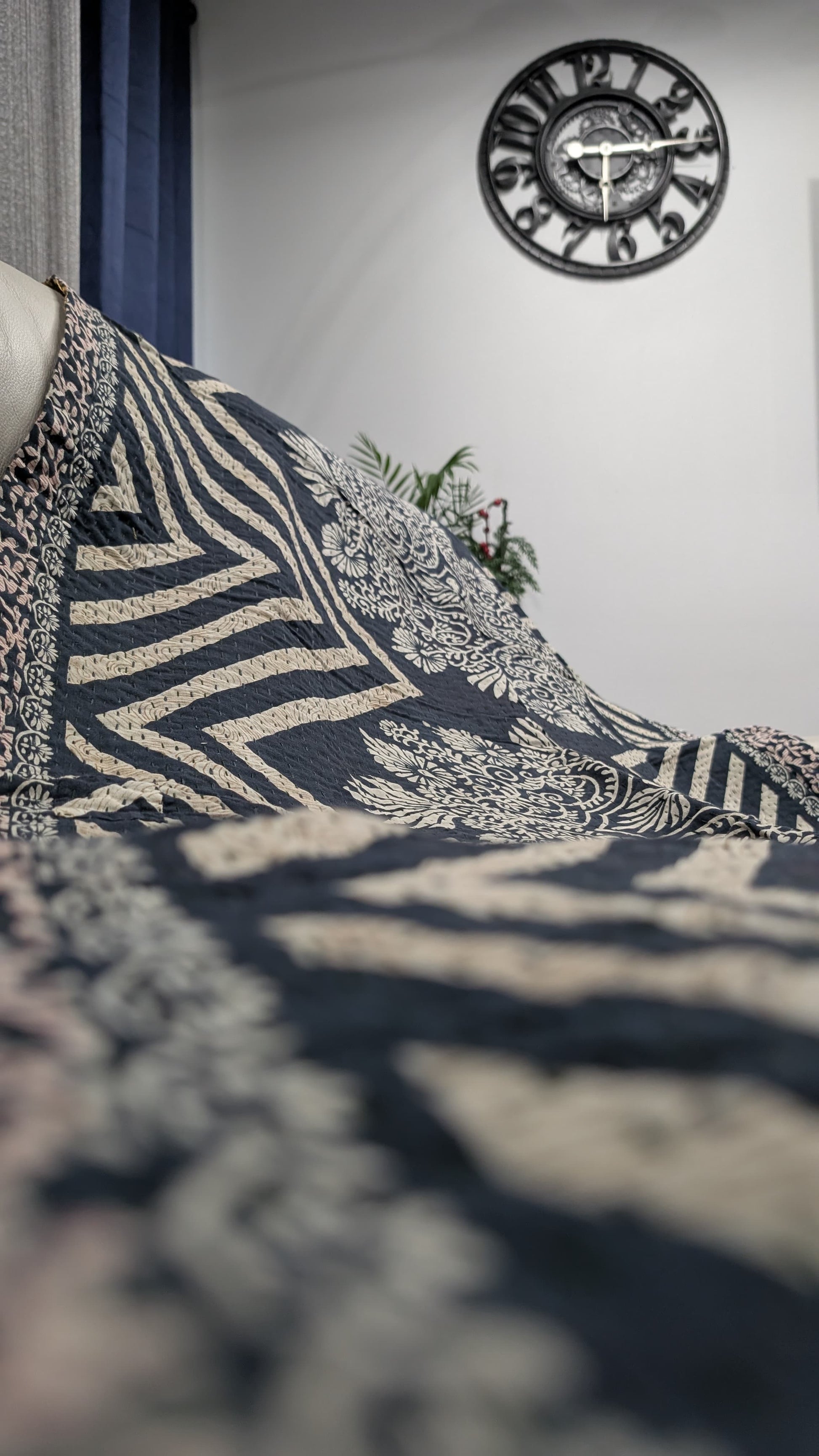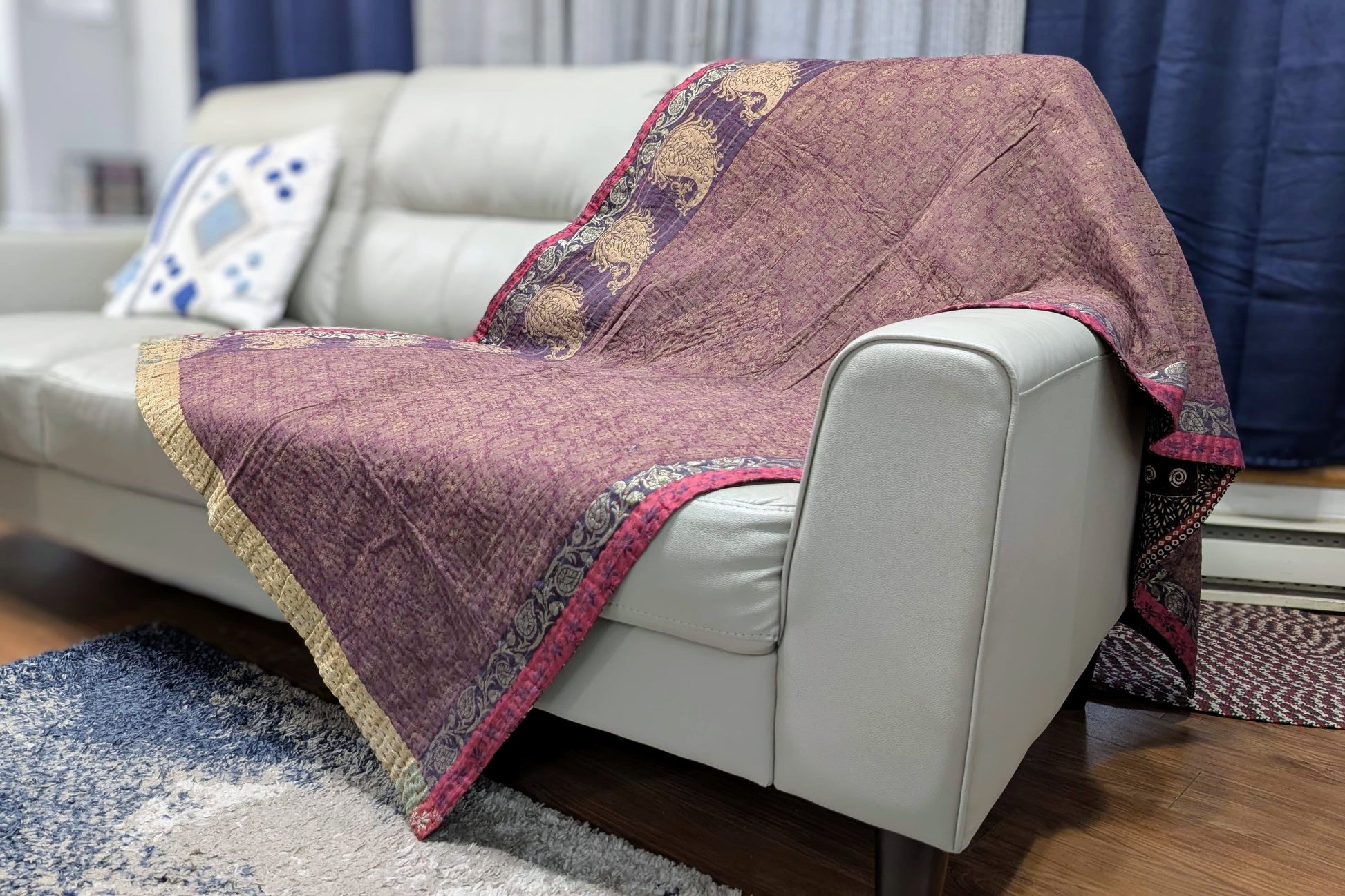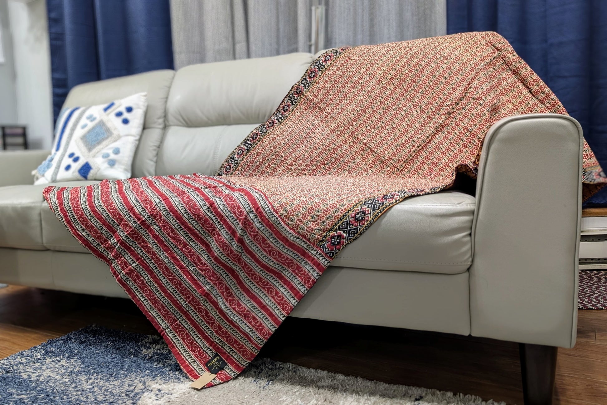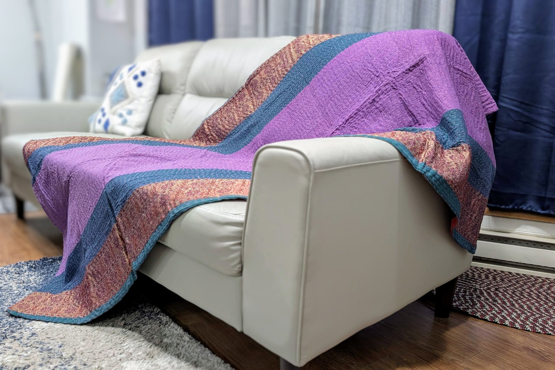Wrap yourself in generations of tradition with our reversible medium-weight Kantha quilt—where the soul of Bangladesh meets sustainable comfort. Meticulously hand-stitched by rural artisans from recycled and upcycled saris, each quilt tells a visual story through its intricate running stitches and naturally faded patchwork of colours.