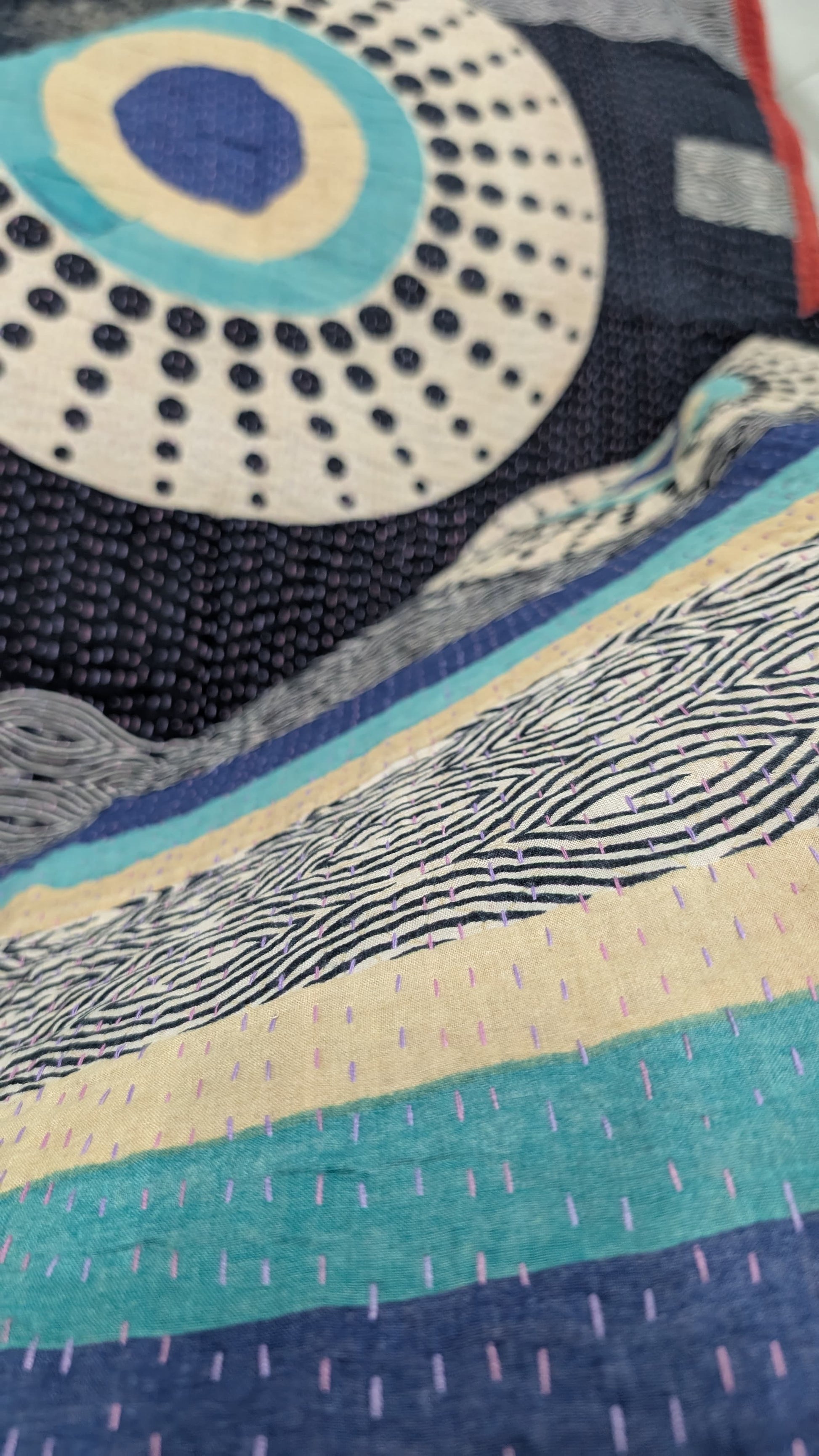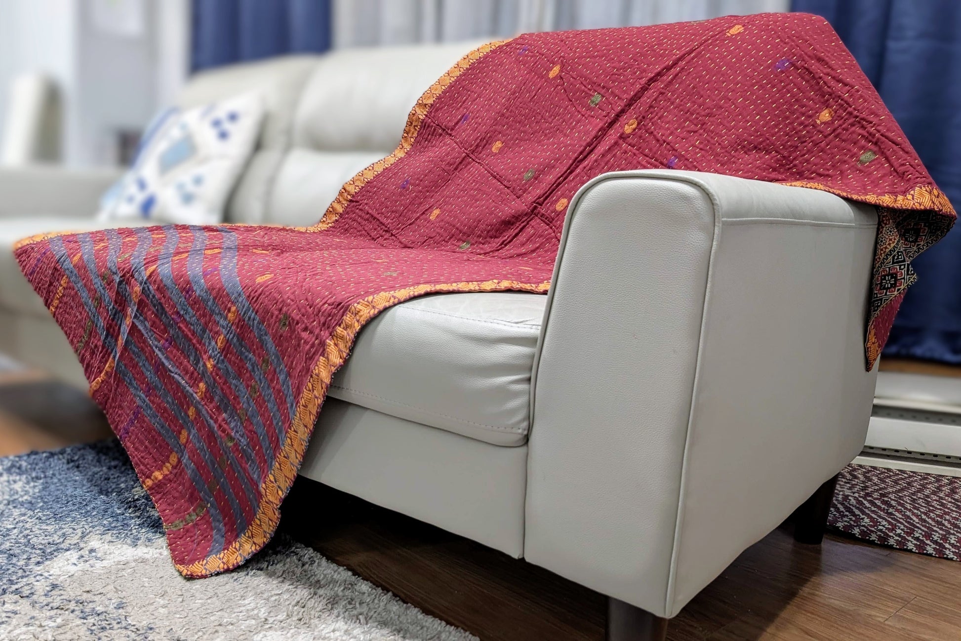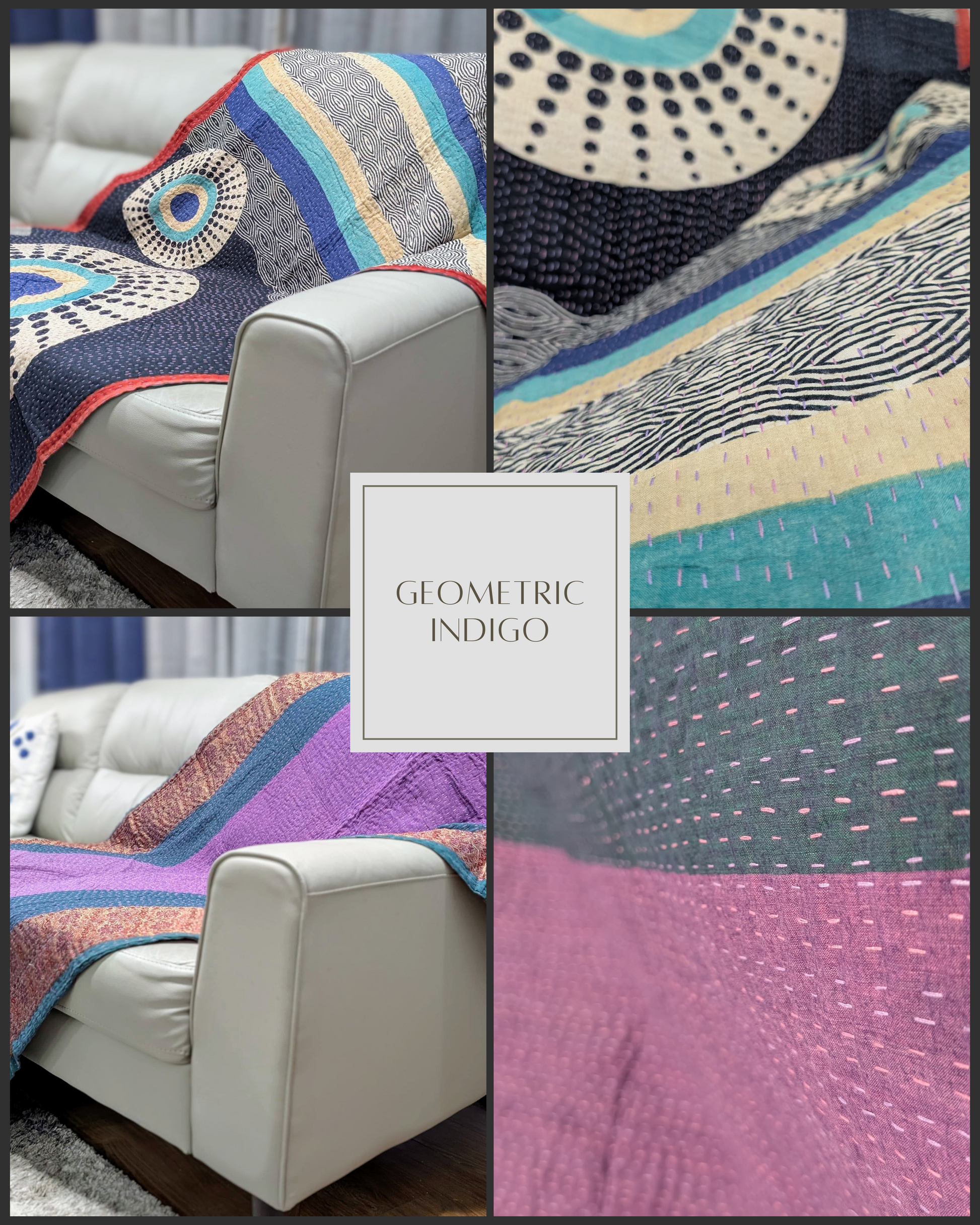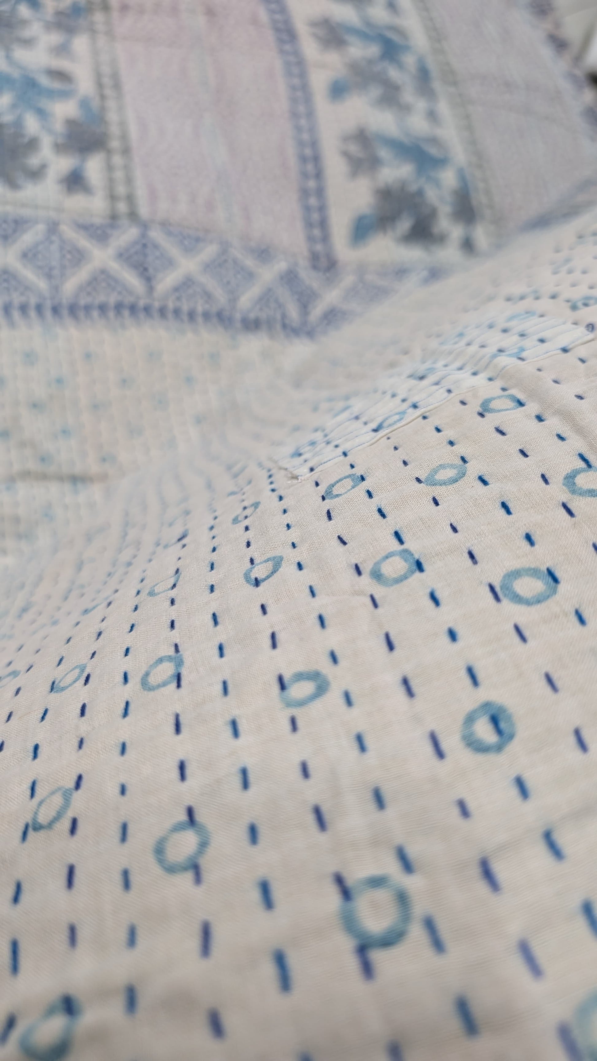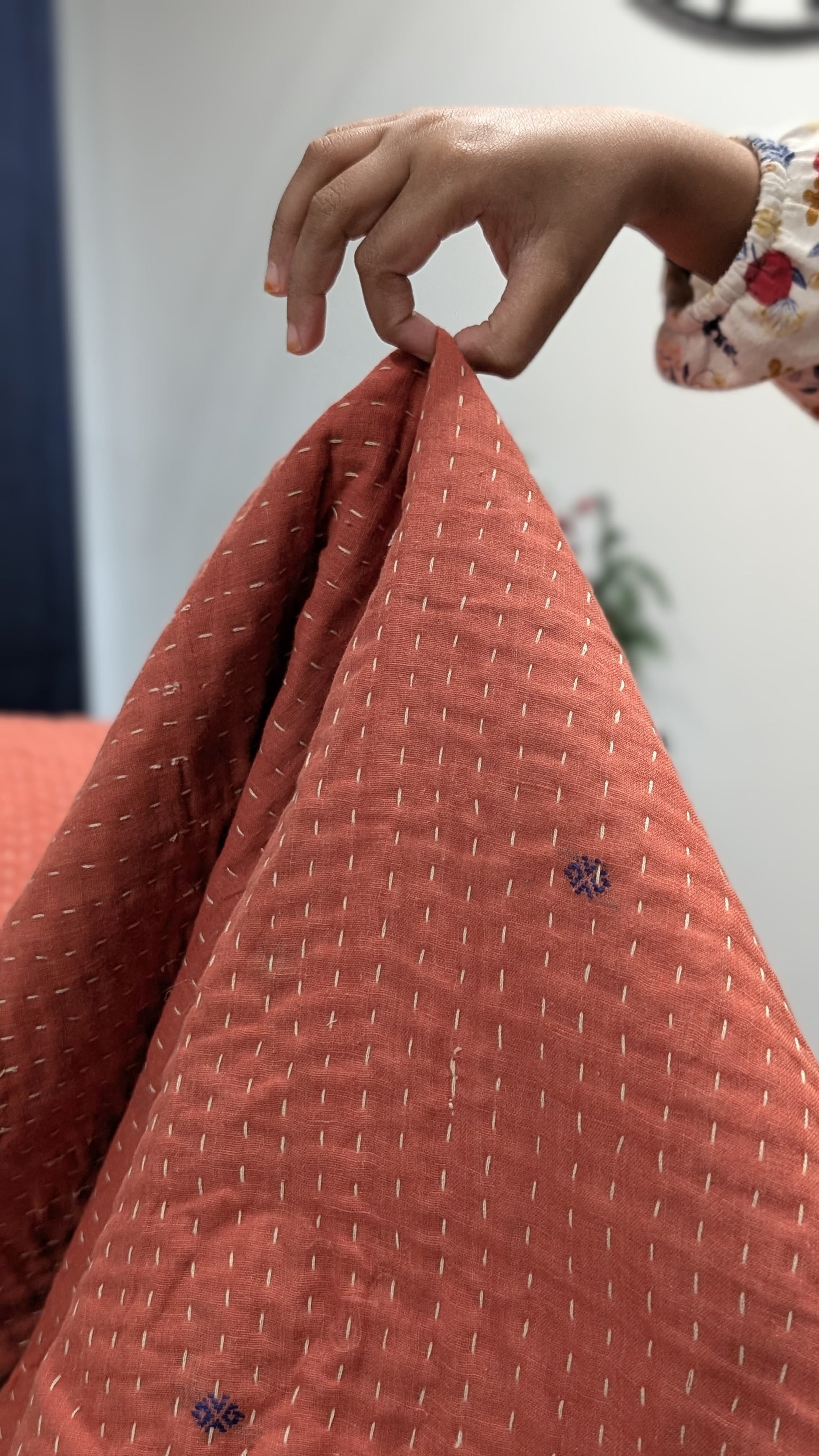 - 4 layers of soft sari cotton hand-quilted reversible with the signature Kantha running stitch.
