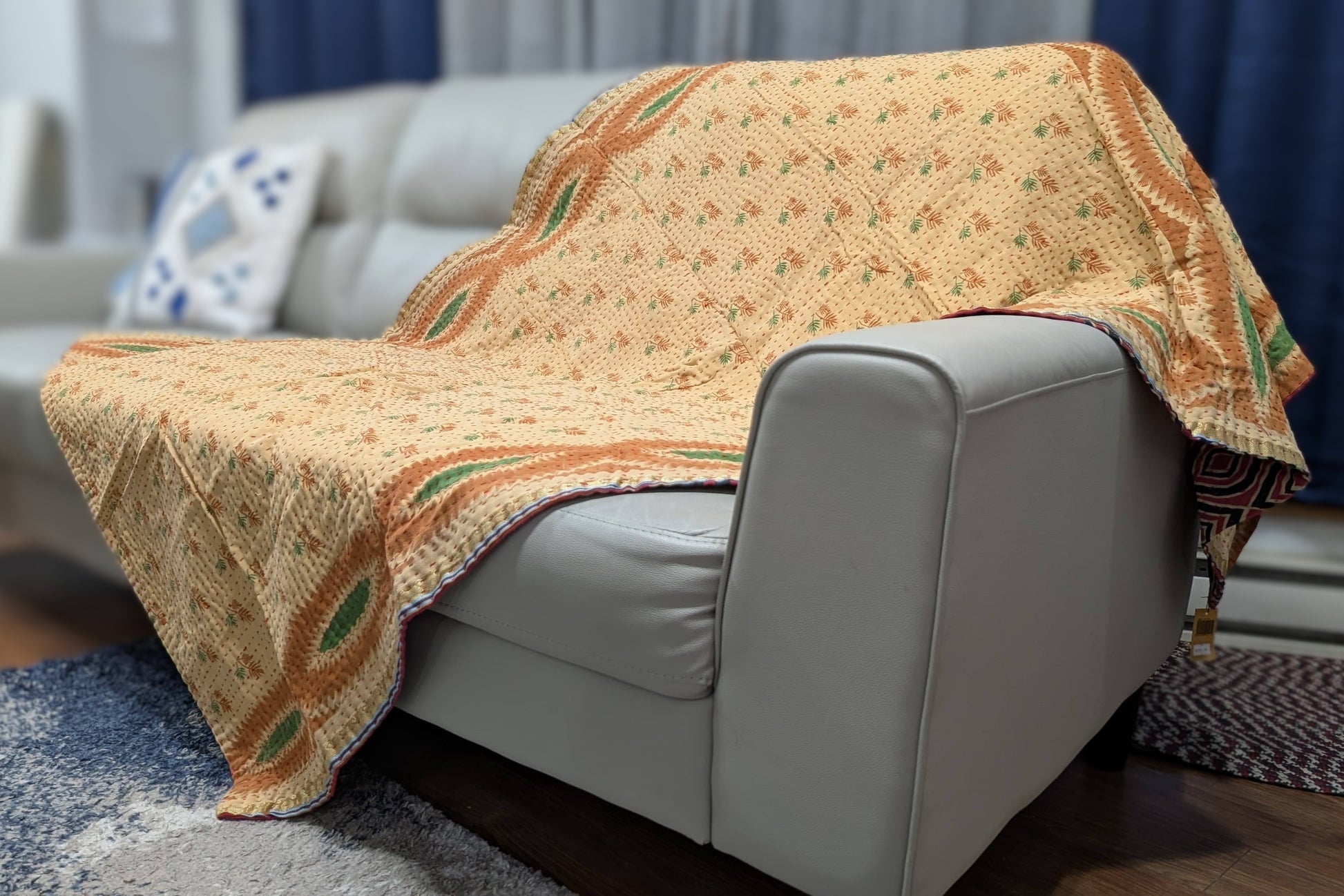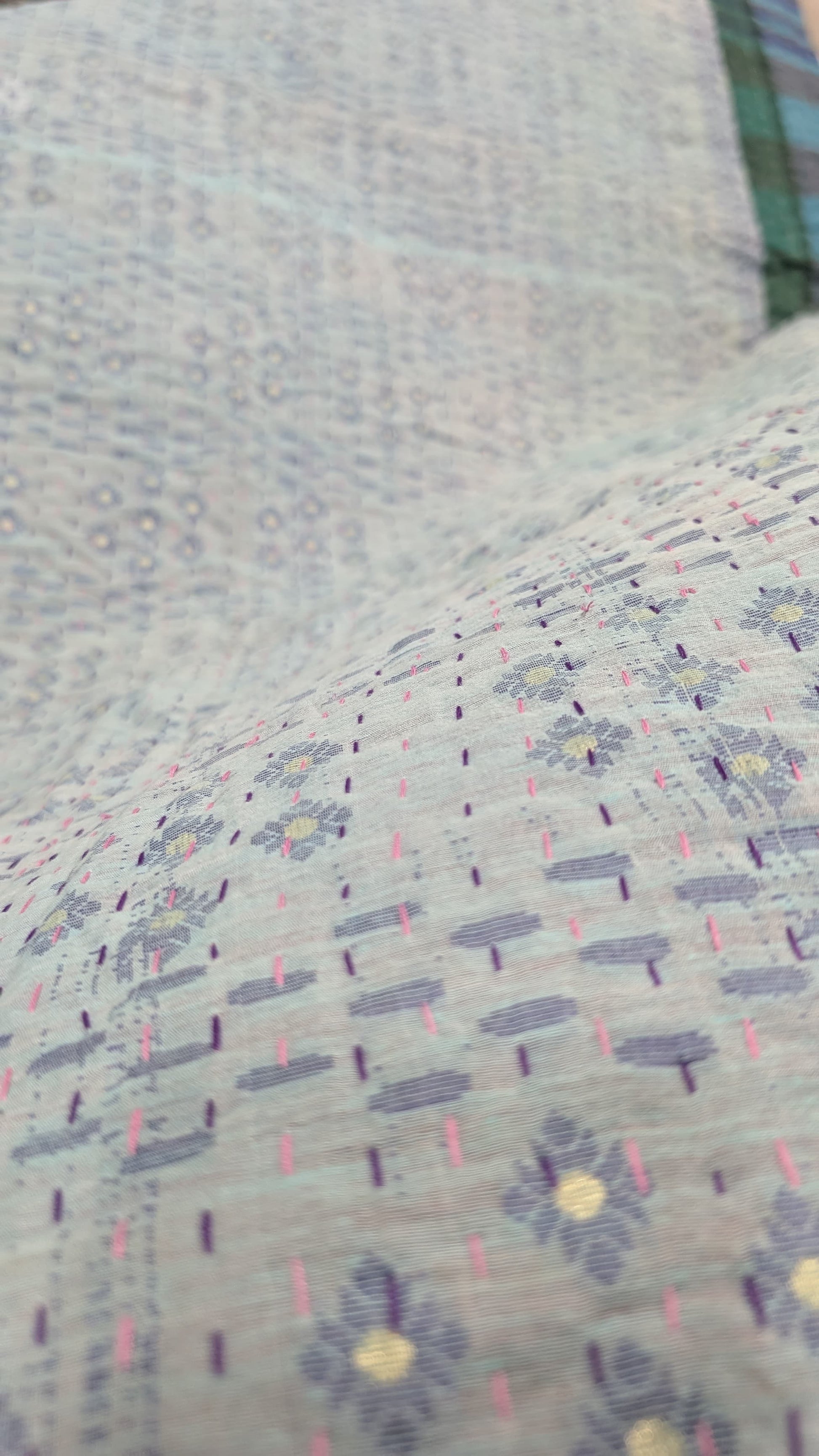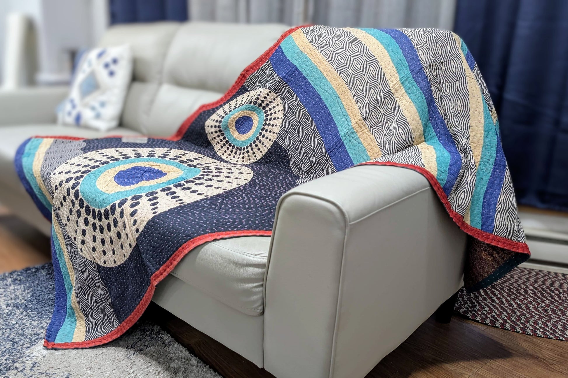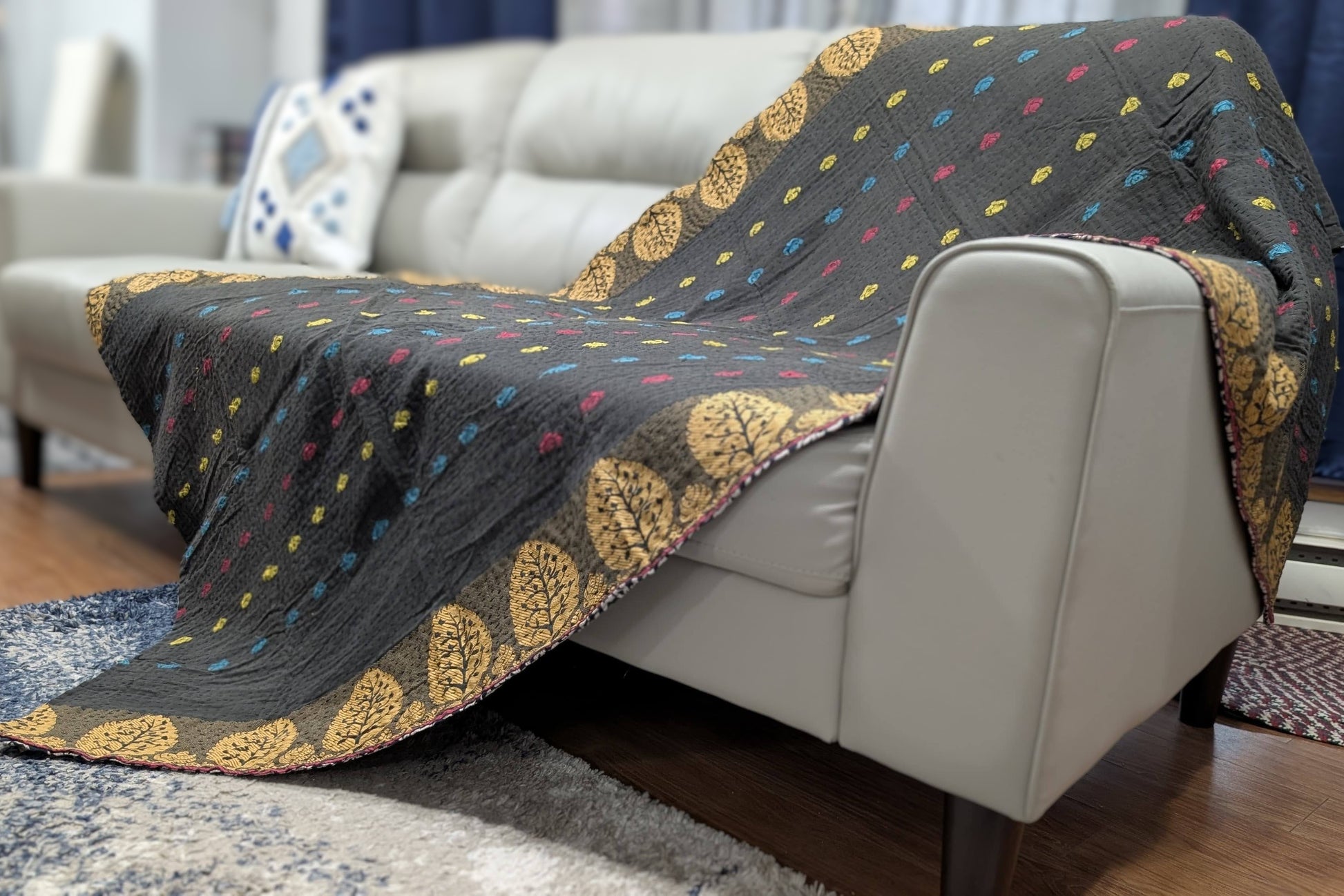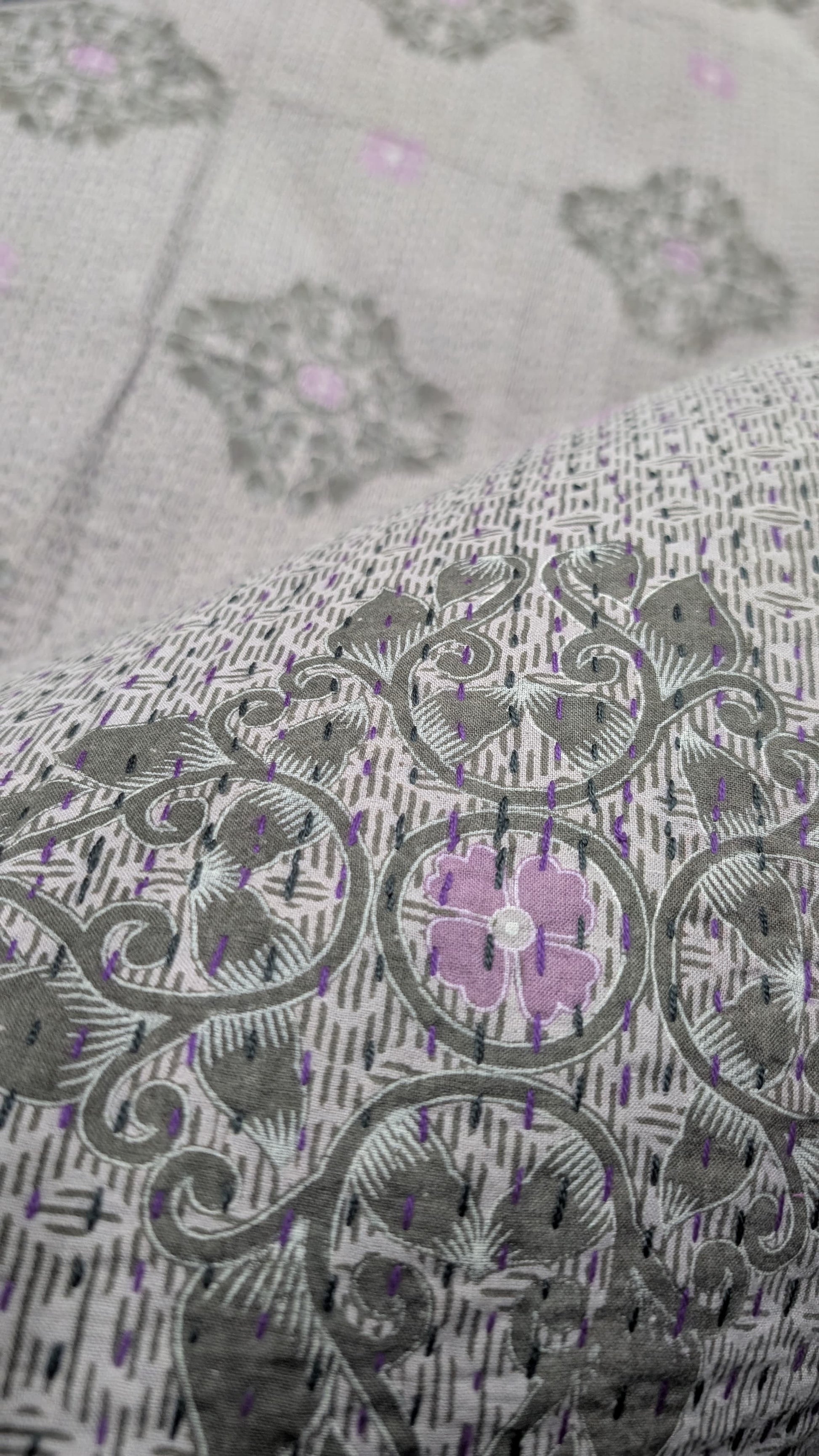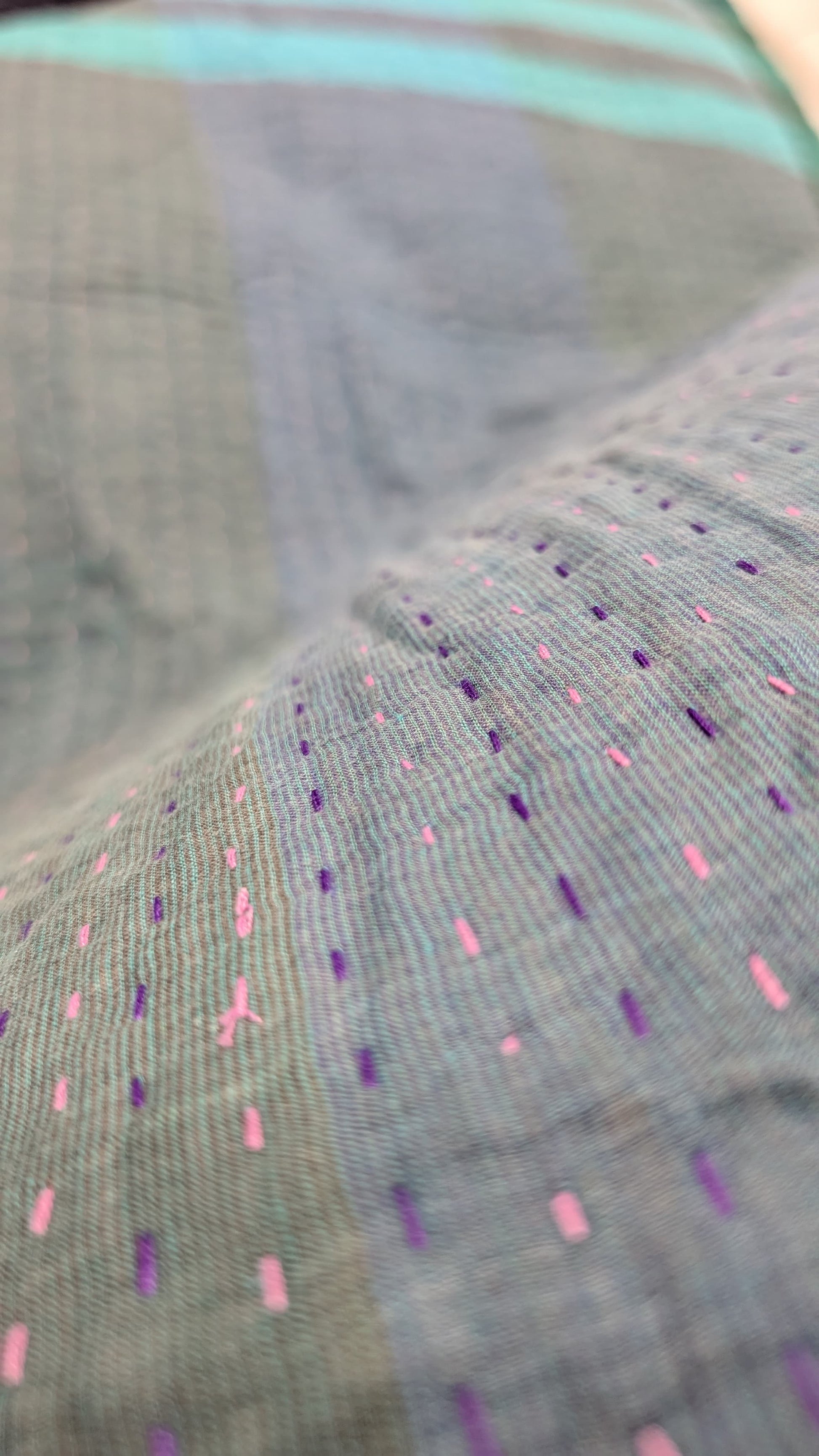 - 4 layers of soft sari cotton hand-quilted reversible with the signature Kantha running stitch.