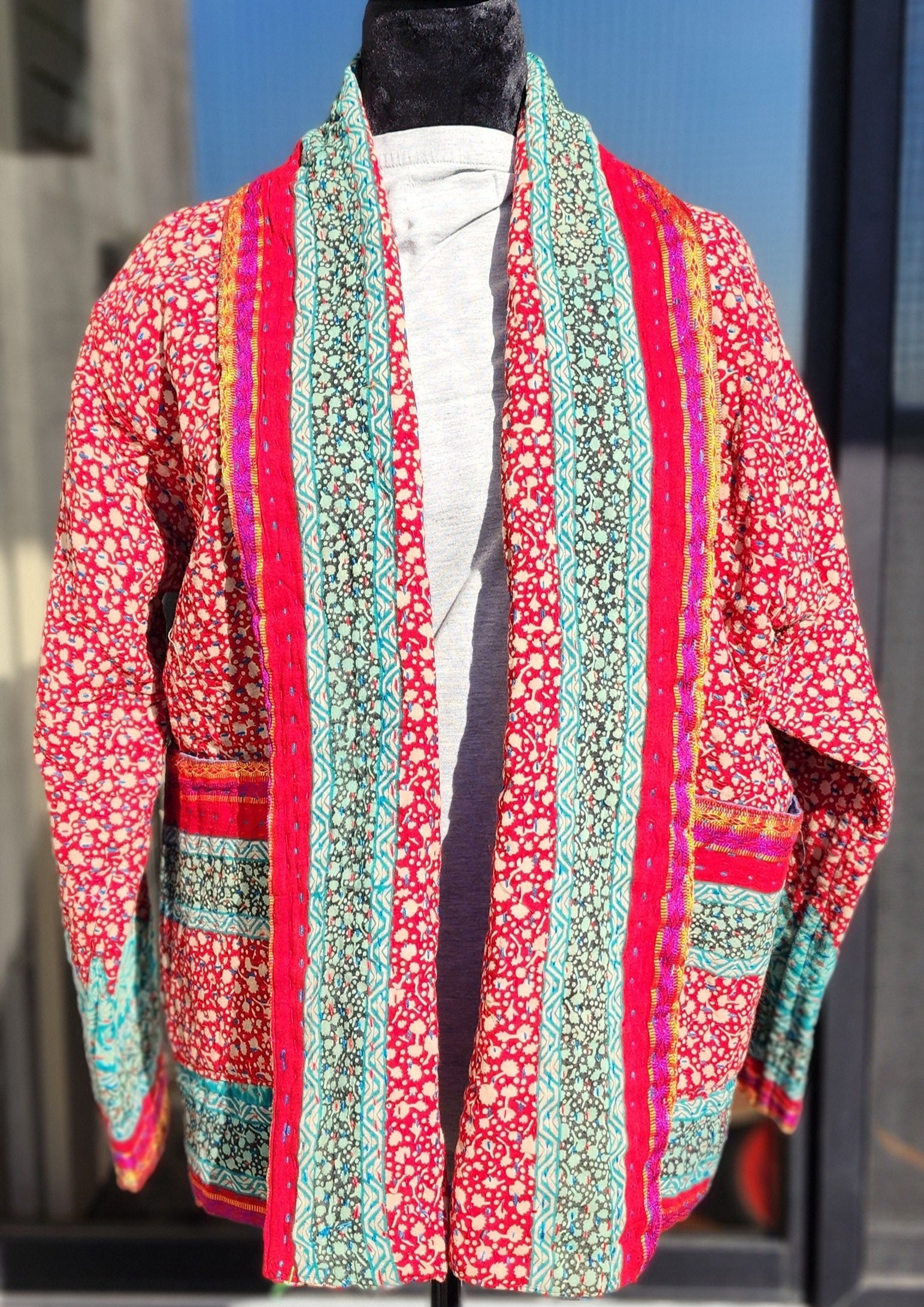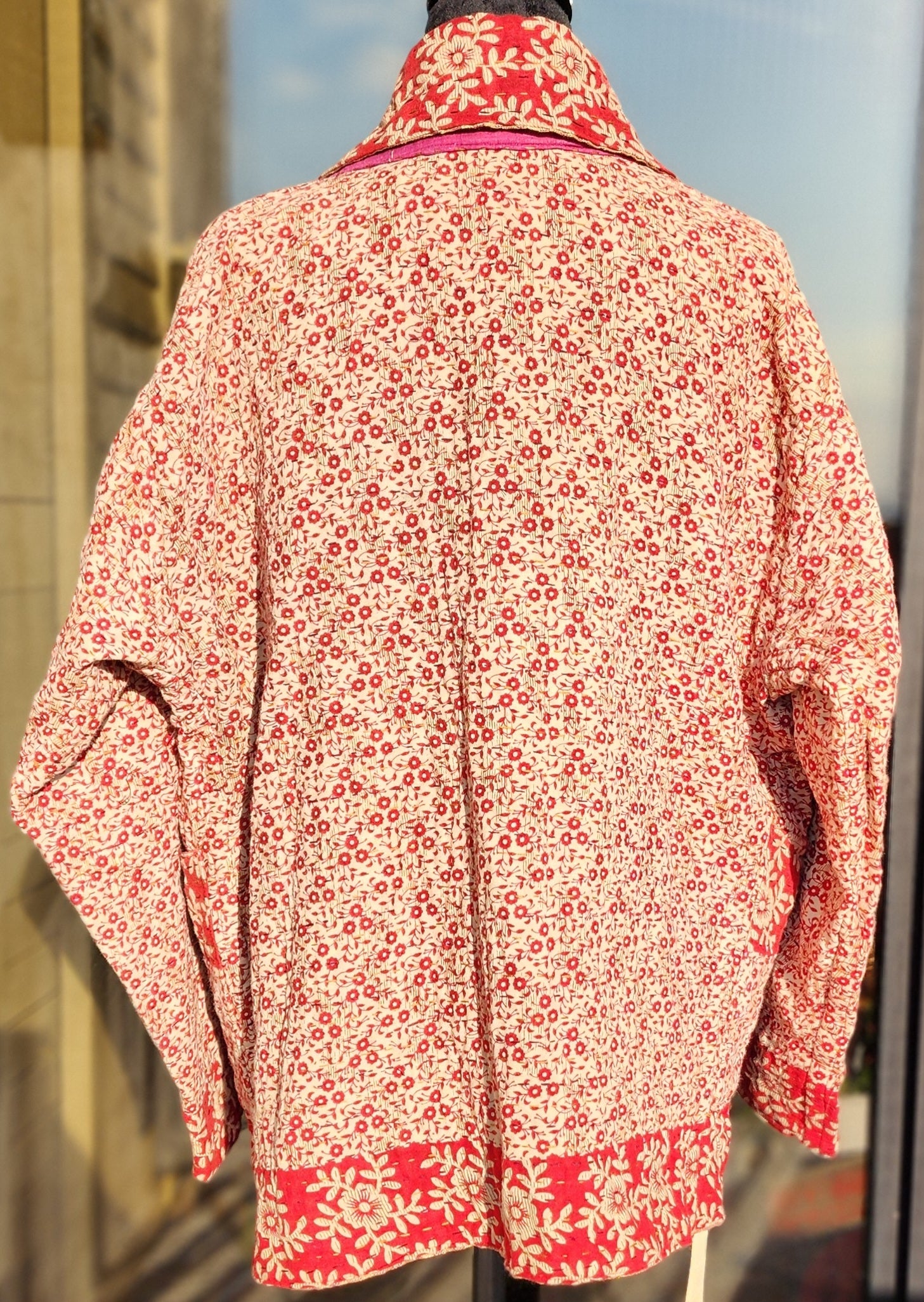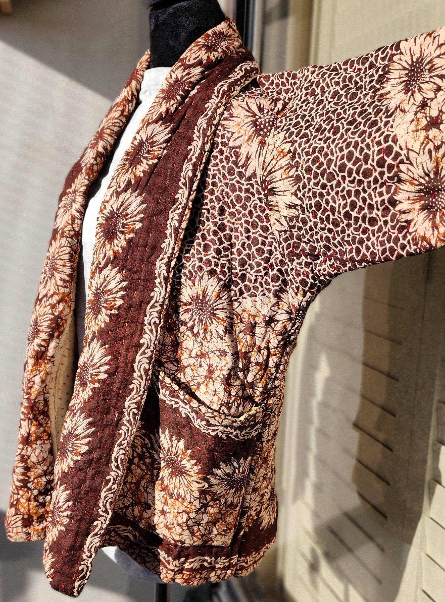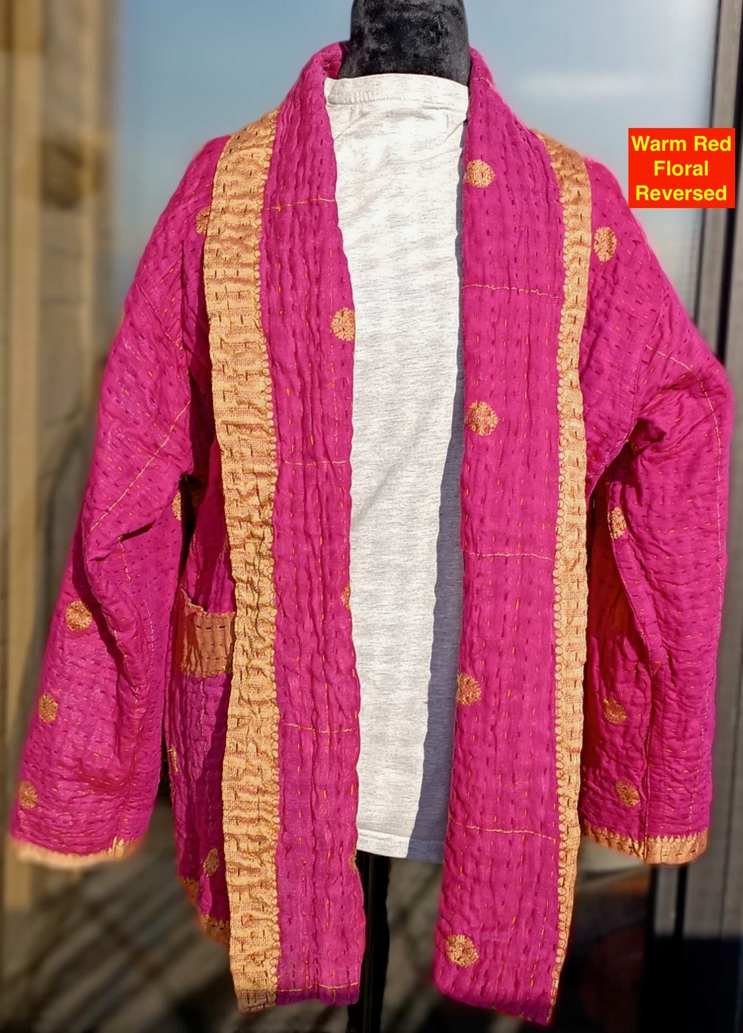 Wrap yourself in the artistry of two cultures with this reversible, hand-stitched Kantha kimono—a wearable canvas where Bangladeshi tradition meets contemporary design. Meticulously crafted by rural artisans from recycled and upcycled saris, every stitch tells a story of resilience, while the relaxed kimono silhouette offers effortless elegance for modern wardrobes.