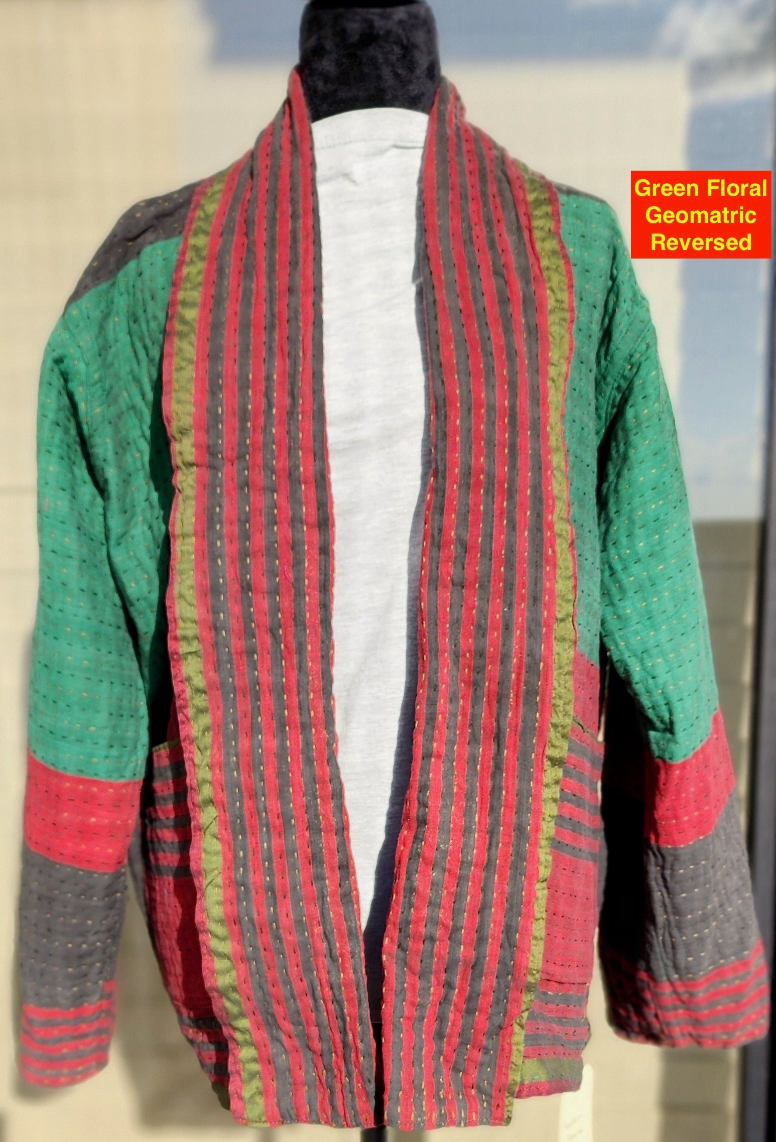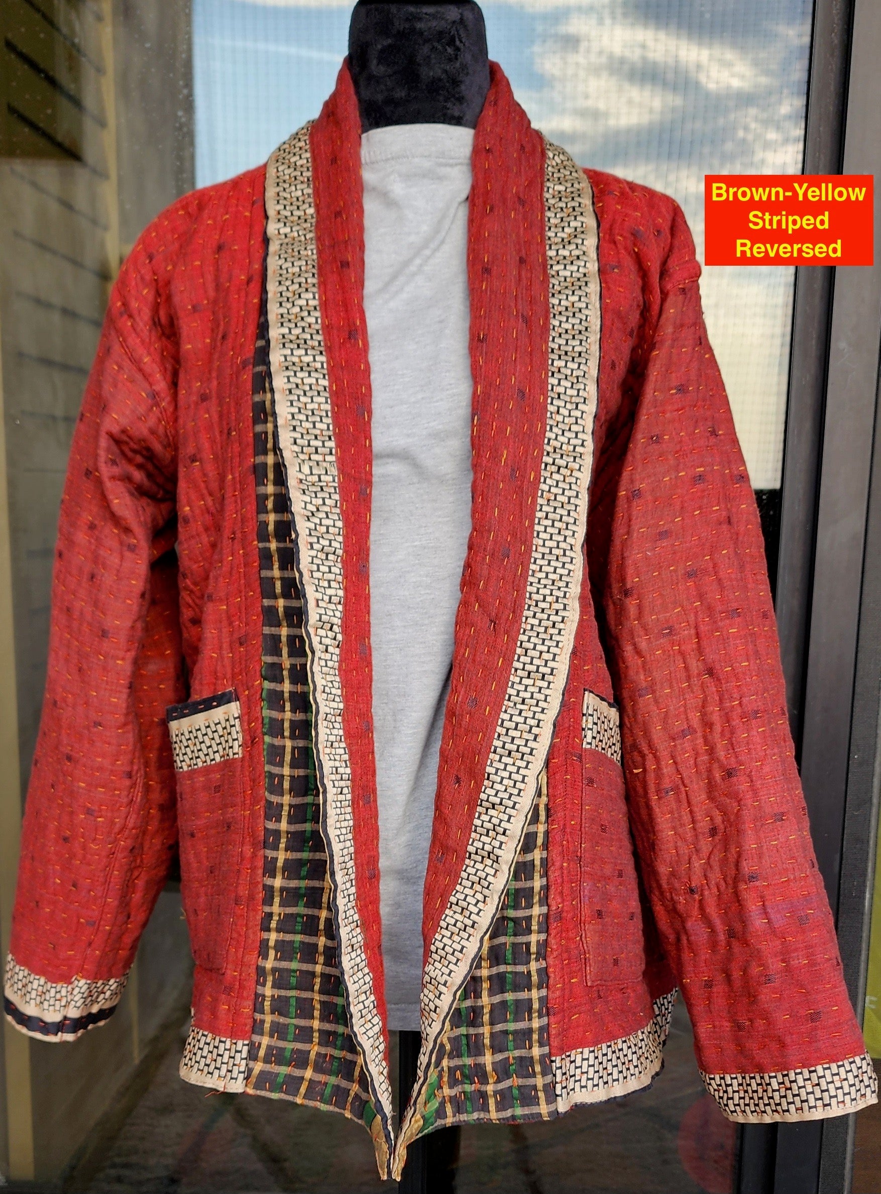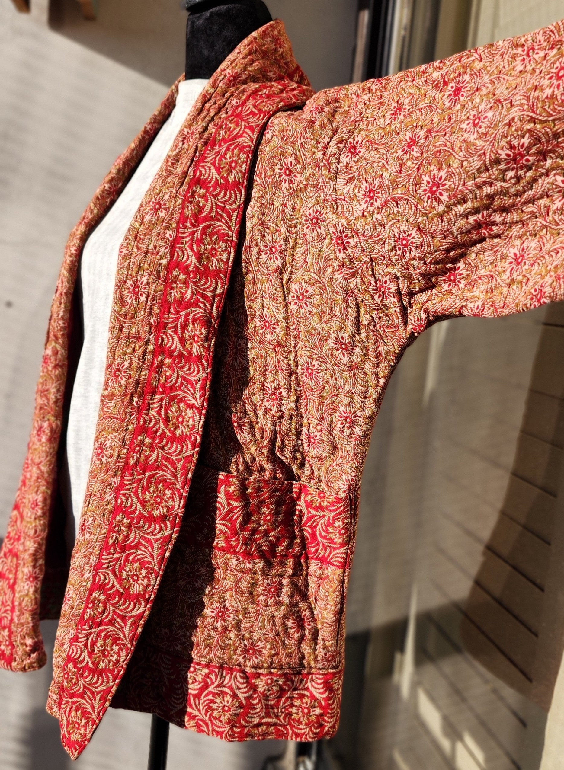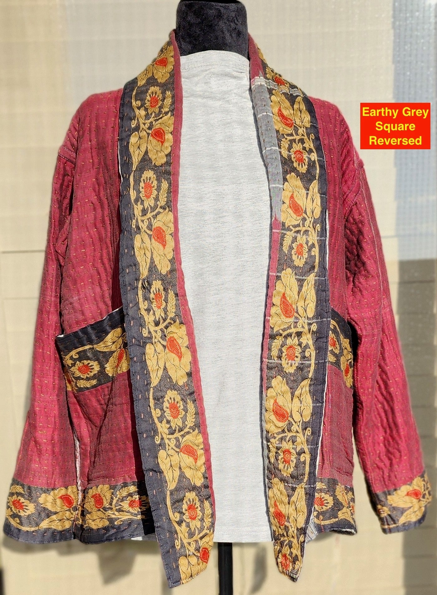 Wrap yourself in the artistry of two cultures with this reversible, hand-stitched Kantha kimono—a wearable canvas where Bangladeshi tradition meets contemporary design. Meticulously crafted by rural artisans from recycled and upcycled saris, every stitch tells a story of resilience, while the relaxed kimono silhouette offers effortless elegance for modern wardrobes.