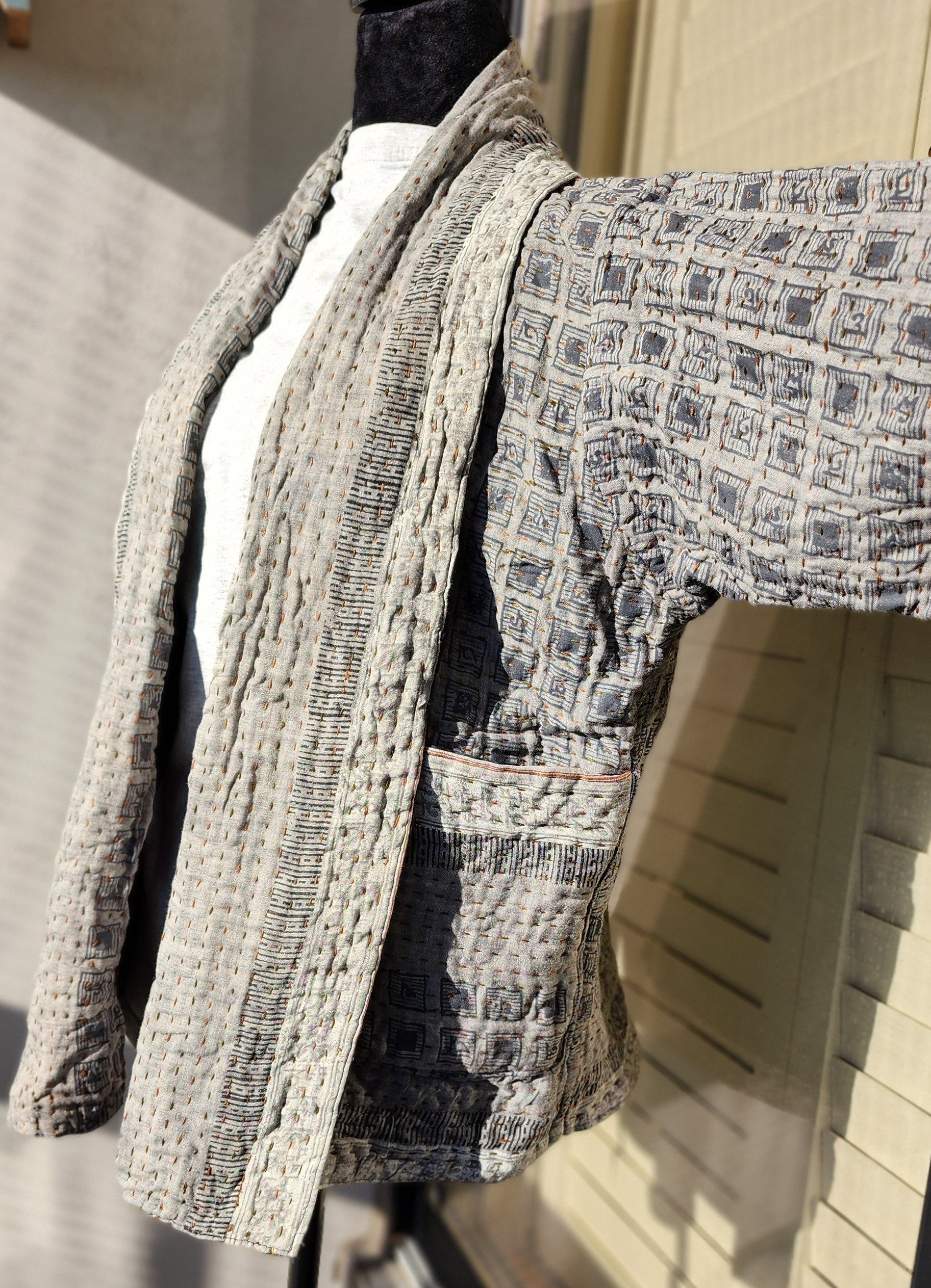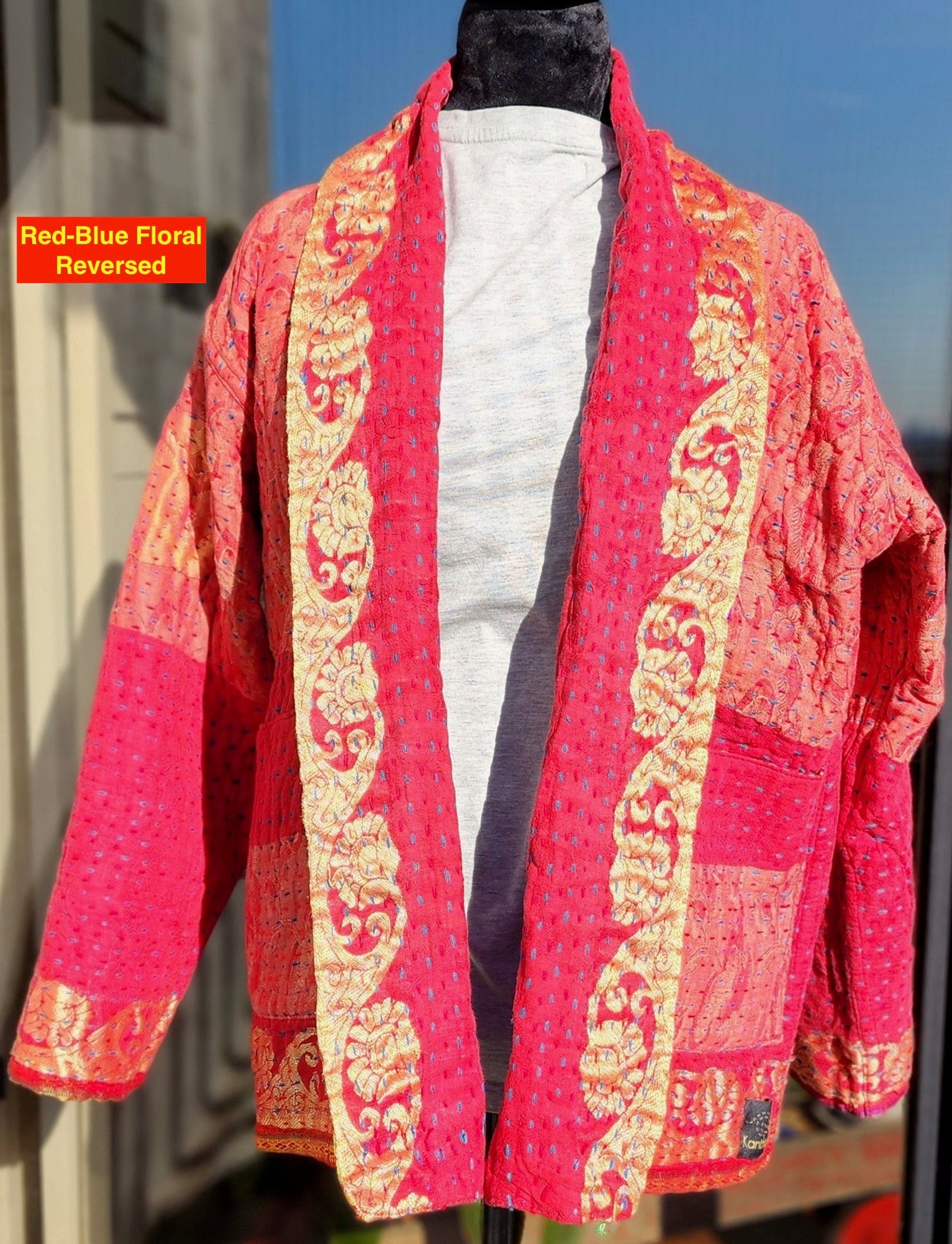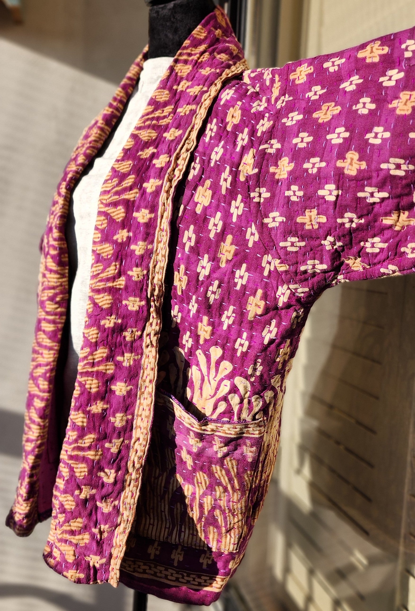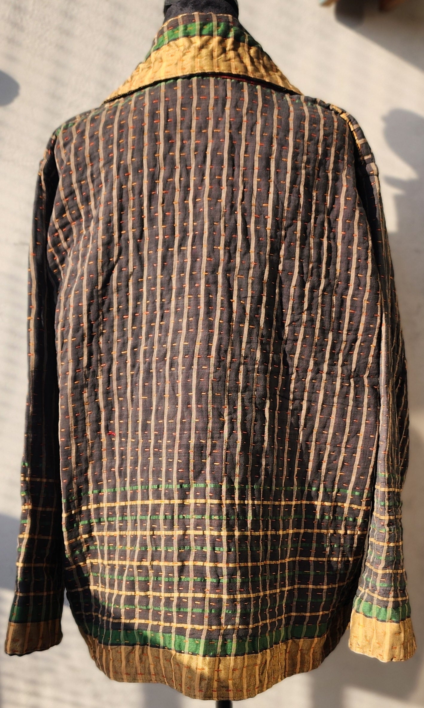 - Intricate Kantha embroidery blooms across the back and sleeves, with motifs passed down through generations.