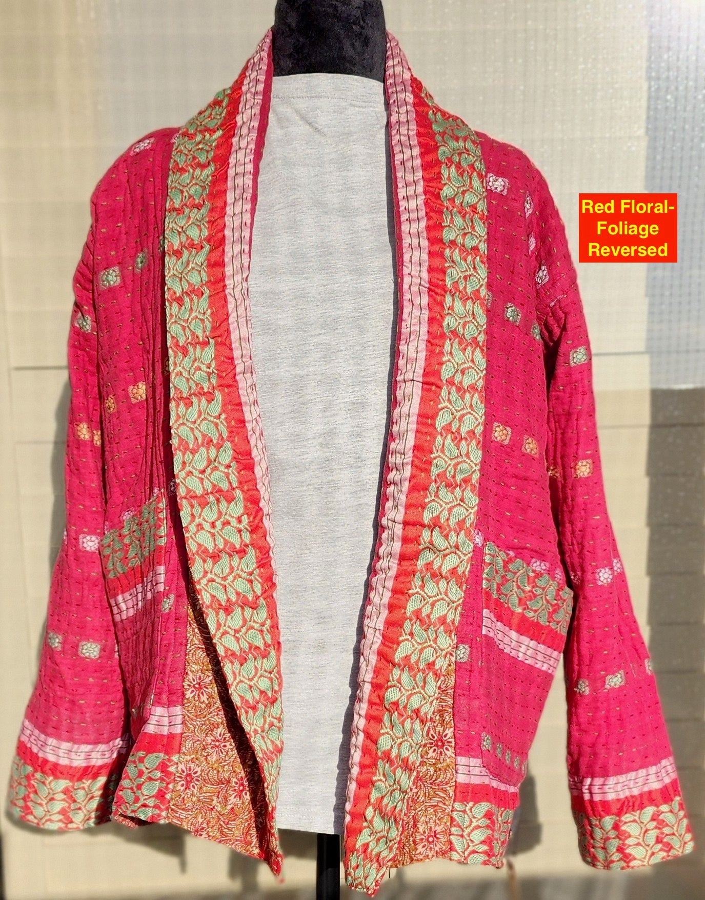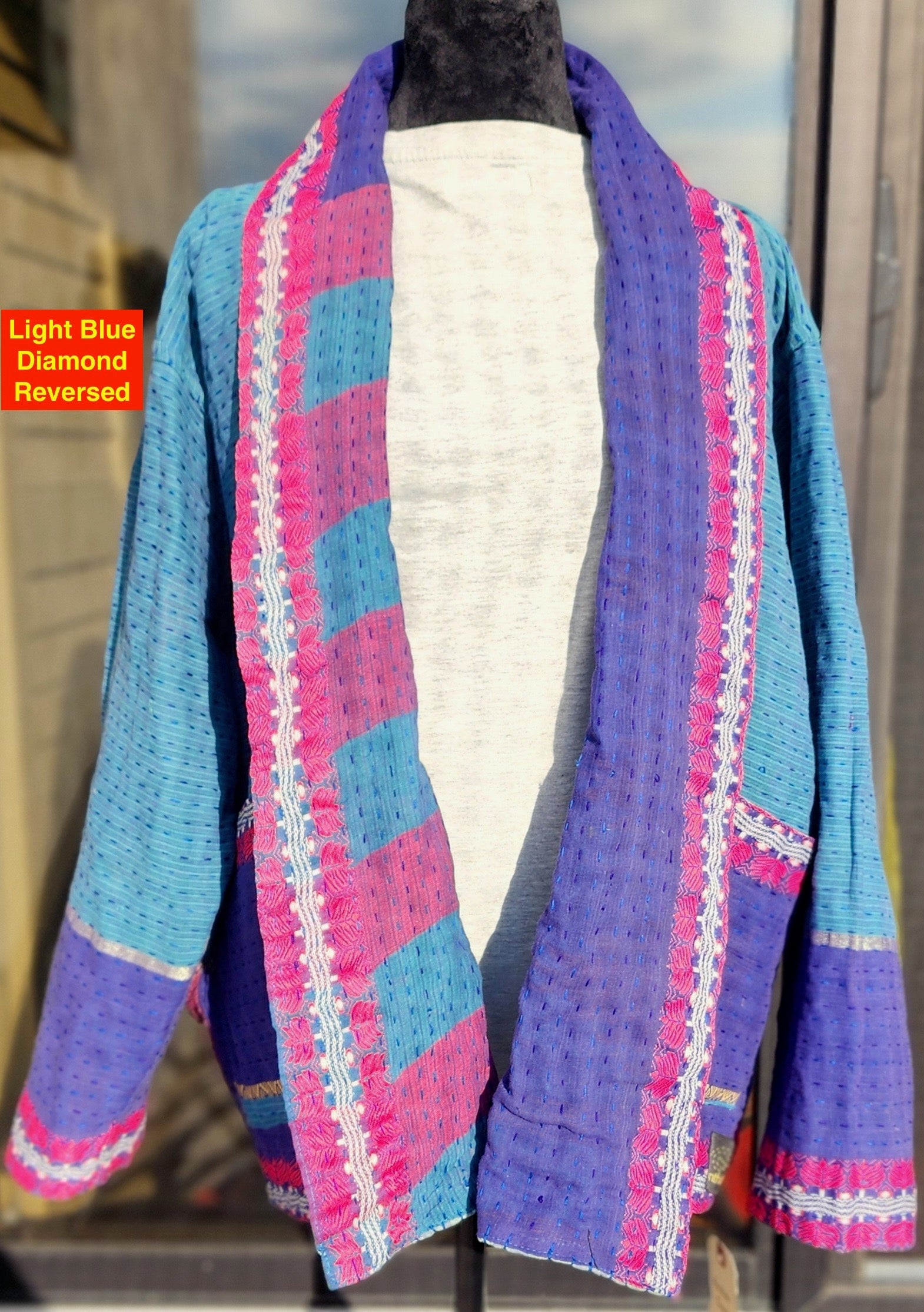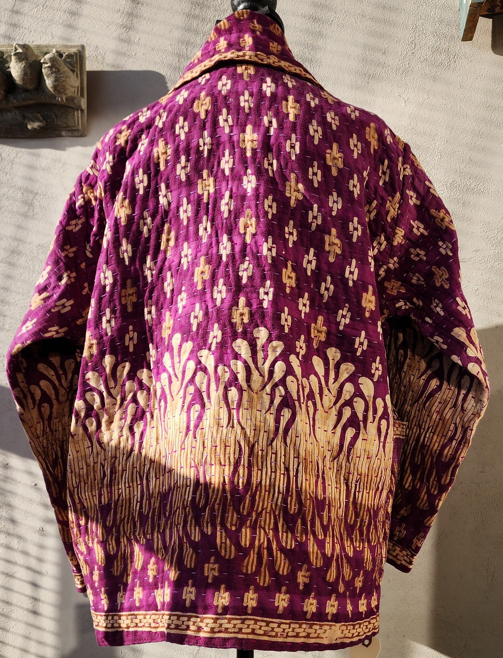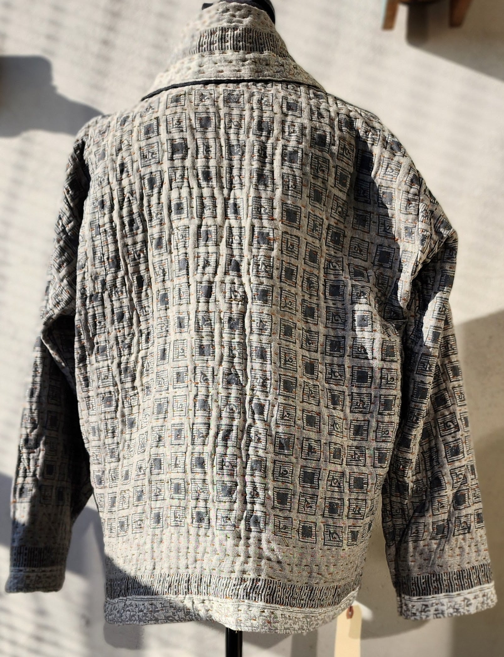 - Intricate Kantha embroidery blooms across the back and sleeves, with motifs passed down through generations.