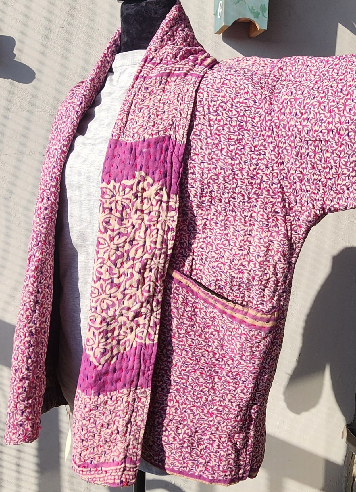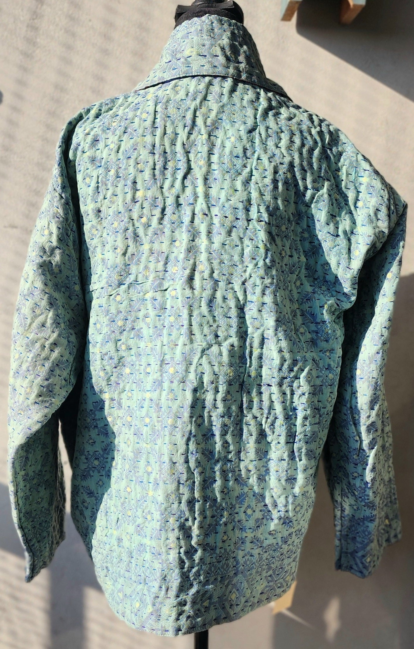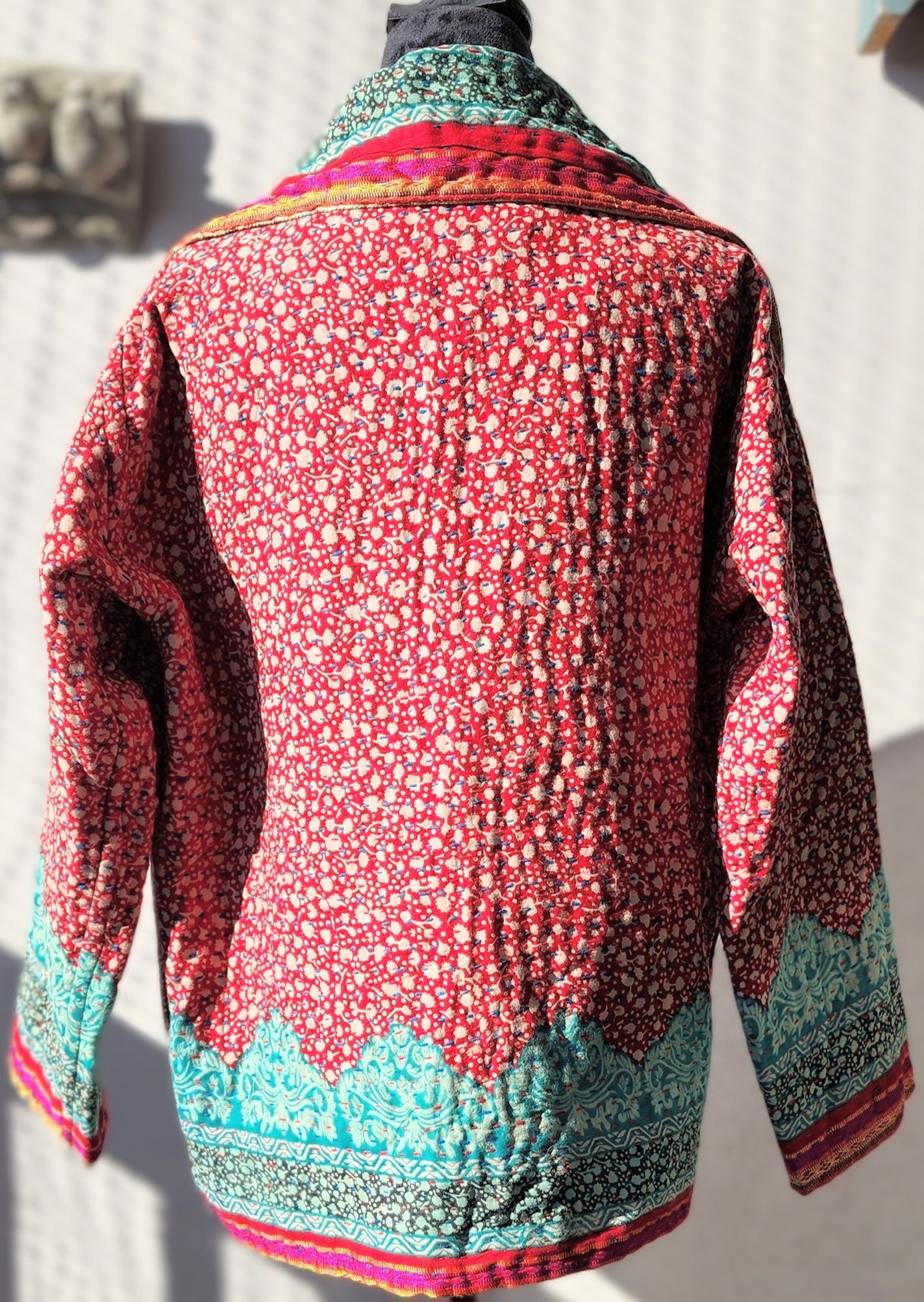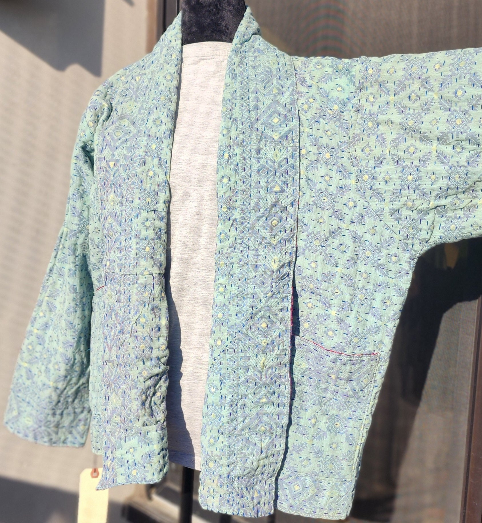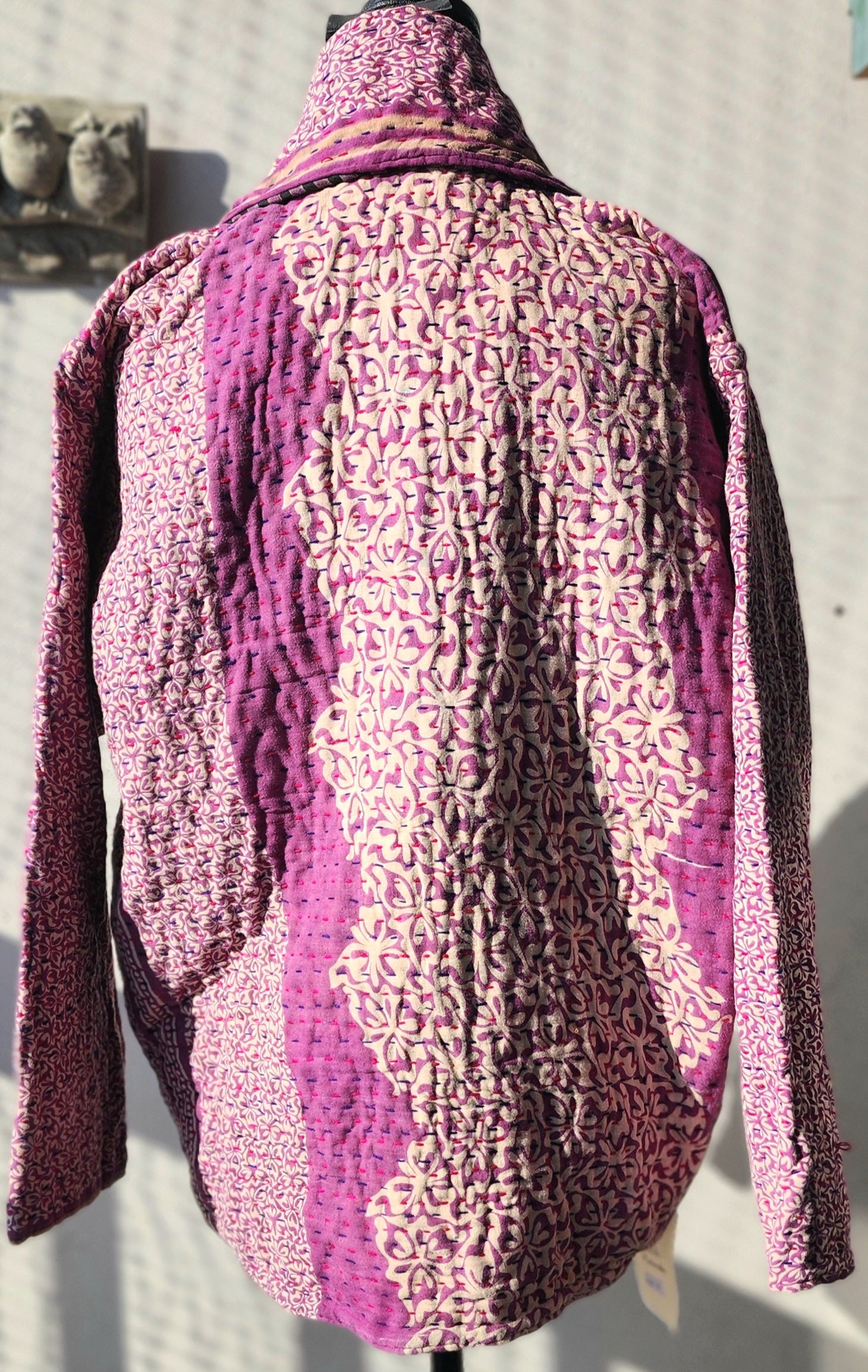 - Intricate Kantha embroidery blooms across the back and sleeves, with motifs passed down through generations.