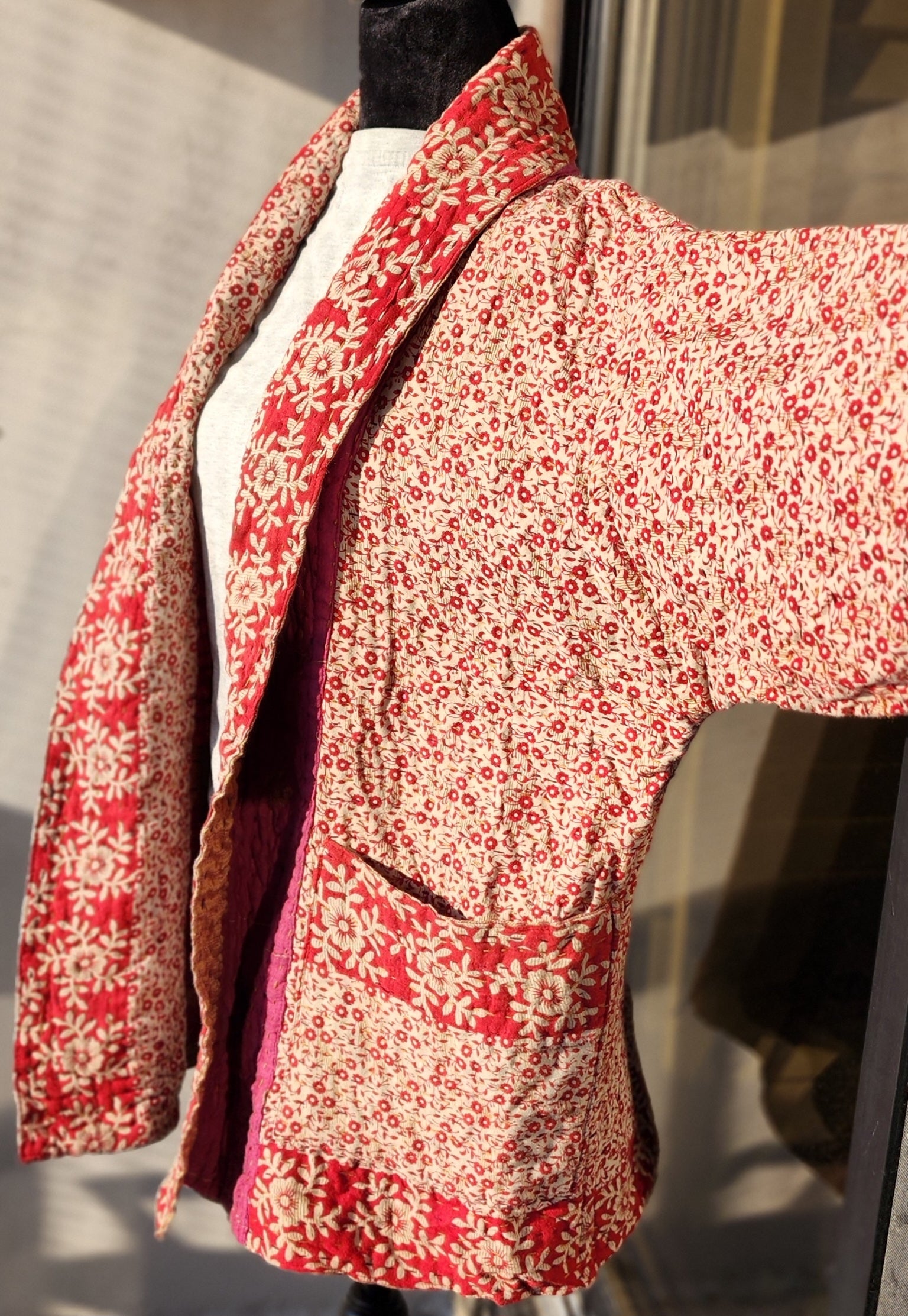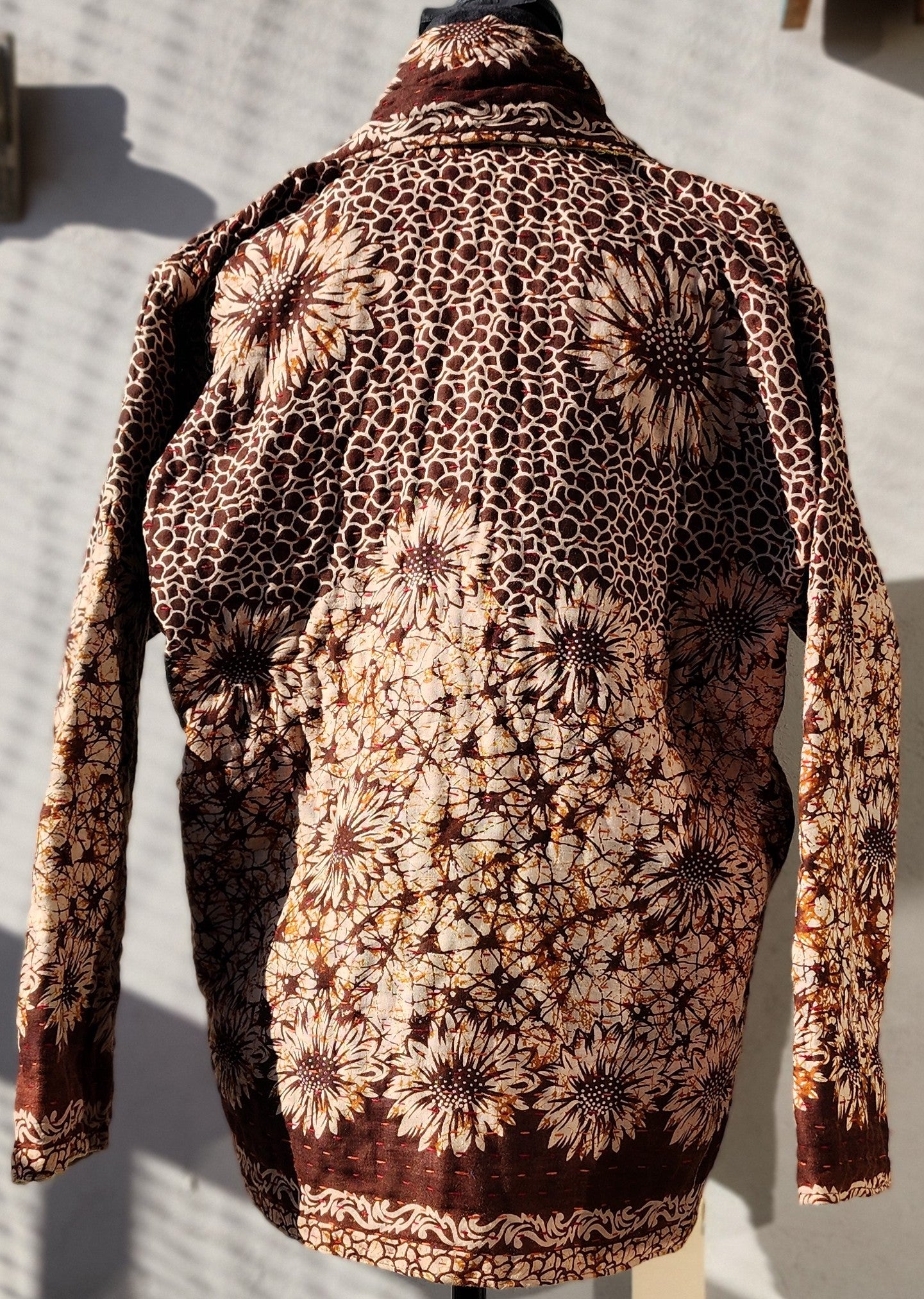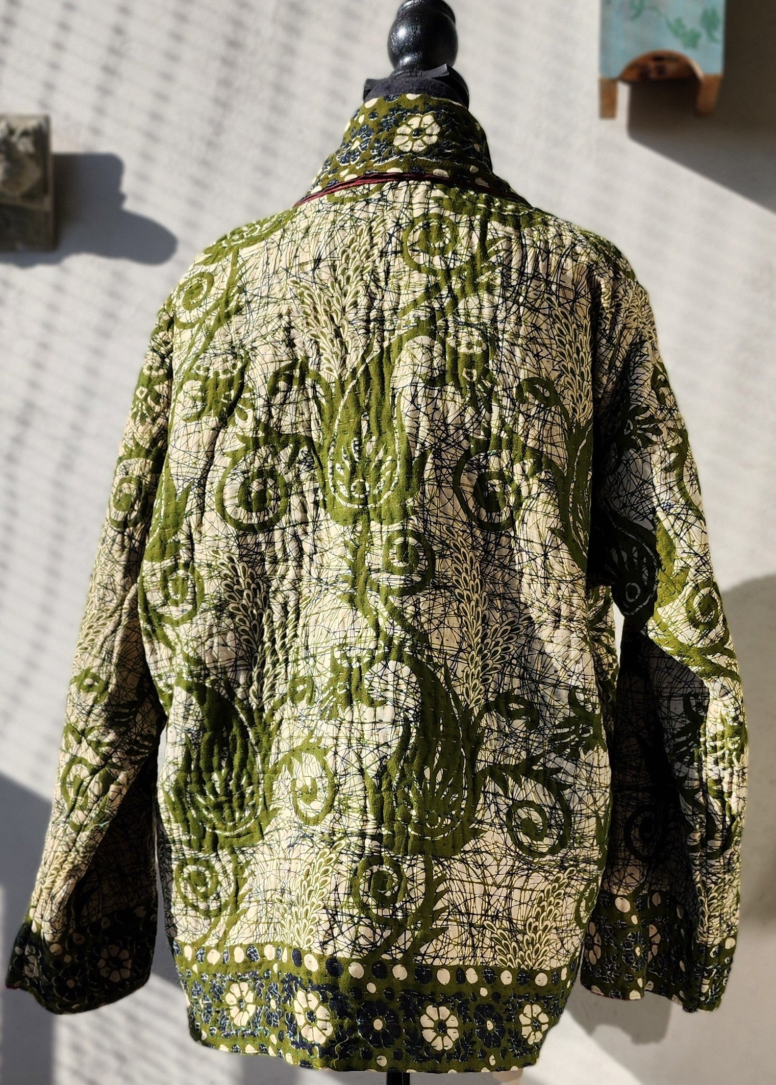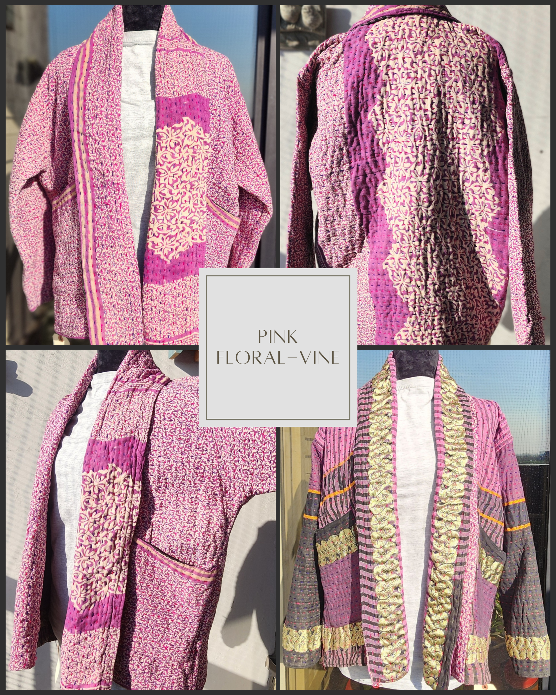 - Intricate Kantha embroidery blooms across the back and sleeves, with motifs passed down through generations.